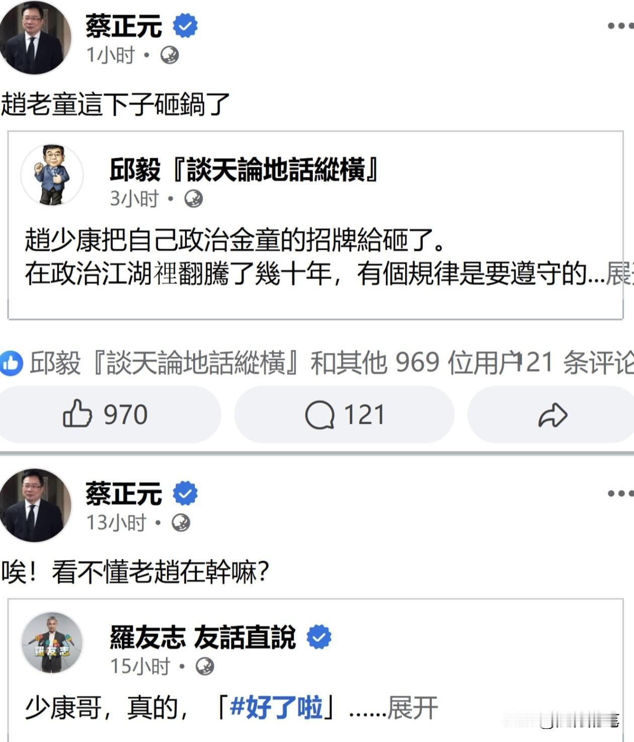 目前不满赵少康的人越来越多了,包括蔡正元、邱毅和王炳忠等人都不断发文质疑赵少康“境外网军介入”一说。本来郝龙斌即使有多不好,赵少康在背后撑腰都没有人公开谴责,但是现在看到郝龙斌选情不佳,赵少康已经急得跳到郝龙斌前面来了,这几天赵少康不断质疑郑丽文的“网军介入”,已经让他的关注度盖过了郝龙斌,赵少康还不知道他的作为已经开始适得其反。蔡正元等人看到赵少康如此不分青红皂白的找理由帮助郝龙斌,也已经看不过眼,公开发文谴责。赵少康这一波操作不仅形象尽失,很可能最终也不能达到目的。