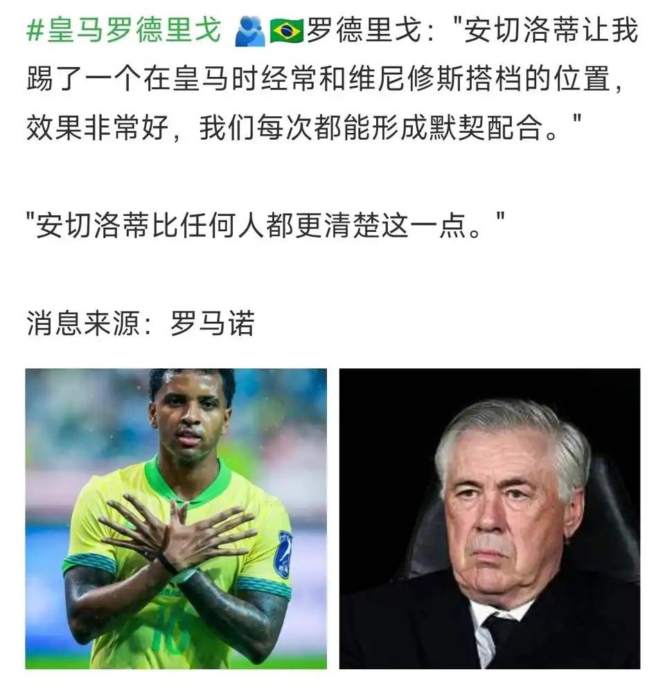 罗德里戈话里有话呀,他说安切洛蒂知道他能踢哪个位置,效果非常好。 所以他在巴西队进球了,而皇马得不到机会上场。 其实上赛季他就丢掉皇马主力,还就是安切洛蒂干的,阿隆索只是接着执行而已。 夏天皇马真想卖罗德里戈,1亿太高了。 现在他一点数据都没有,明夏还能卖5000万吗?再低皇马真不想卖了,无解。[捂脸]