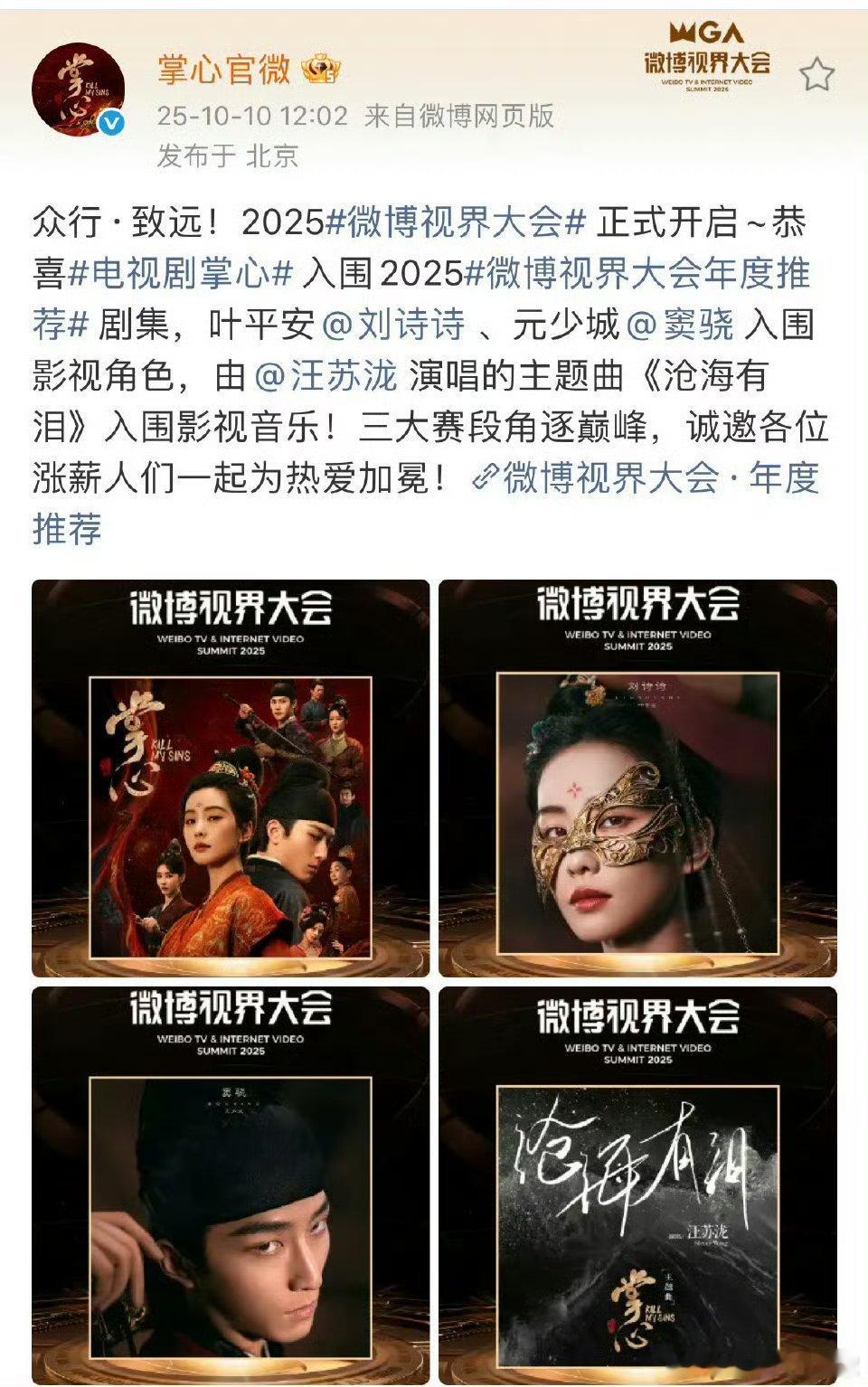 刘诗诗2025年两部剧《掌心》《淮水竹亭》两部剧,两个角色叶平安,东方淮竹都入围微博视界大会年度推荐