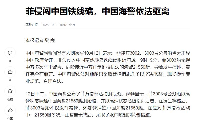 菲律宾又再南海挑事了,10月12日,中国与菲律宾在南海再度爆发冲突,据中国海警官方公布的信息显示,菲律宾这次派出了3002、3003号两艘公务船,在未经中国政府允许的情况下,非法闯入中国南沙群岛铁线礁附近海域。 当天,菲律宾两艘公务船3002、3003号,硬闯咱们南沙群岛铁线礁海域,中国海警21559艇则是当场开炮拦截。别误会,是高压水炮,喷得菲船浑身湿透调头就跑。现场视频里,菲船3003号还像发了疯似的,故意往咱们船上撞。 要我说,菲律宾这波操作纯属“记吃不记打”。铁线礁是啥地方?那可是咱们老祖宗从汉朝就开始管的地儿!两千年前汉武帝派船队下南洋,就把这一带岛礁叫“涨海崎头”;宋朝文献里写得更清楚,铁线礁属于广南西路琼管吉阳军管辖,连渔民出海用的《更路簿》都给它起了名字,叫“铁线”。 2025年,自然资源部刚发布的调查报告还在强调,铁线礁生态系统健康,珊瑚覆盖率超60%,妥妥的中国领土。菲律宾现在跑过来说“这是我的”,咋的,你家历史书是昨天才印刷的? 再看菲律宾这两艘船,3002和3003号都是他们海警的主力舰艇,排水量超过2000吨,平时专门在南海搞事情。这次更绝,直接开着船往咱们执法艇上撞,视频里能清楚看到菲船船头都凹进去一块。 有军事专家分析,菲律宾这是学美国搞“自由航行”那一套,想通过制造摩擦来试探中国底线。但他们忘了,咱们海警现在可不是吃素的。21559艇配备的高压水炮射程超过100米,一炮下去能把人冲飞。去年在仁爱礁,咱们海警就用这招,把菲律宾补给船喷得落荒而逃,这次算是故技重施。 要说菲律宾为啥这么嚣张,还得从他们国内找原因。小马科斯政府现在日子不好过,支持率跌到30%以下,经济又被通胀搞得焦头烂额。为了转移国内矛盾,只能在南海搞事情刷存在感。 更绝的是,菲律宾最近还修改了所谓“海洋区域法”,把咱们黄岩岛和南沙群岛大部分海域都划拉到自己名下,简直是“纸上圈地”。这种做法连他们自己国内都看不下去,前总统杜特尔特公开批评小马科斯“在玩火”,说南海仲裁案早就被中国打脸,现在还这么折腾只会让菲律宾更被动。 不过菲律宾可能忘了,咱们手里攥着一张王牌——《南海各方行为宣言》。2002年中国和东盟十国签的这份协议,明确说了要通过谈判解决争议,反对单方面采取行动。可菲律宾倒好,这边签着协议,那边就搞仲裁、改法律,把国际法当儿戏。更搞笑的是,他们一边喊着“维护航行自由”,一边在南海搞“军事化”,最近还和美国搞联合军演,在咱们家门口耀武扬威。这种“双标”操作,连东盟其他国家都看不下去,马来西亚外长上个月就公开表态,反对任何加剧南海紧张的行为。 对咱们来说,这次冲突也是一次“练兵”。现在咱们海警已经实现了,对南海主要岛礁的常态化巡航,像铁线礁、牛轭礁这些地方,每隔几天就能看到咱们的船。更厉害的是,咱们还建立了“智慧海洋”系统,通过卫星、无人机和雷达,把南海的一举一动都尽收眼底。这次菲船刚进入铁线礁海域,咱们的海警船就从三亚、永兴岛等地火速赶来,形成了包围之势。有网友调侃说,菲律宾这是“送上门来给咱们当陪练”,正好检验一下新装备的实战能力。 当然,咱们也得防着美国在背后搞小动作。最近美国在南海动作频频,不仅派航母战斗群过来转悠,还和菲律宾搞了史上最大规模的联合军演,兵力超过14000人。更恶心的是,美国还在炒作所谓“中国海警船军事化”,试图拉拢其他国家一起对付咱们。但他们忘了,咱们海警船装武器那是被逼的——菲律宾用军舰撞咱们渔船,越南在南沙填海造陆,咱们要是不还手,难道等着被欺负? 说到底,南海问题的根子在美国。美国为了遏制中国崛起,故意在南海制造矛盾,让菲律宾、越南这些国家当“马前卒”。但他们没想到,咱们根本不吃这一套。从黄岩岛到仁爱礁,从填海造陆到常态化巡航,咱们一步一步把主动权握在了自己手里。现在的南海,早就不是几十年前那个任由西方列强横行的地方了。 最后还得给菲律宾提个醒:别以为抱上美国大腿就能为所欲为。看看乌克兰,美国天天喊着“支持”,结果给的都是过期武器;再看看日本,美国说要“保卫钓鱼岛”,真到关键时刻还不是缩脖子。菲律宾要是继续跟着美国瞎折腾,最后只会落得个“竹篮打水一场空”。咱们的态度很明确:南海的事,咱们愿意谈,但前提是互相尊重;要是想打,咱们也奉陪到底! 参考资料:环球时报