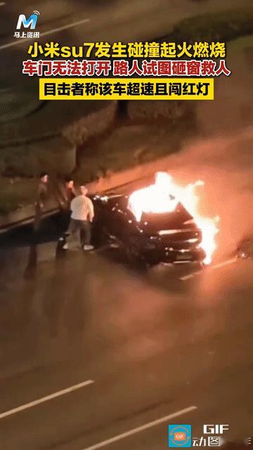 “又是车门打不开!”10月13日凌晨,四川成都天府大道,一辆小米su7因为闯红灯超速发生碰撞起火燃烧。有不少人去救,但因为打不开车门,最终未能救出车里的人,司机不幸遇难了! 从视频里可以看到,火当时烧的很大,但主驾位这边并没有着火,司机当时不知道是昏迷还是清醒的。有四个男子试图去救人,一开始去拉车门,但拉不开。其中一个男子就用手肘去击打玻璃也打不破,用脚踹也不行,大家急得四处去找东西打玻璃! 可惜最终也没能救出来,司机当时该有多绝望啊! 哎,又是车门打开救不了人,这都都多少起了!小米 su7 的门把手外面没有机械功能,这是一个重大缺陷应该全面召回, 哪怕车辆处于解锁状态,只要断电了,外面也拉不开的! 当然关键还是司机开太快了,又是闯红灯又超速,自己找死谁有办法!只是估计家人又要找车公司的事了!