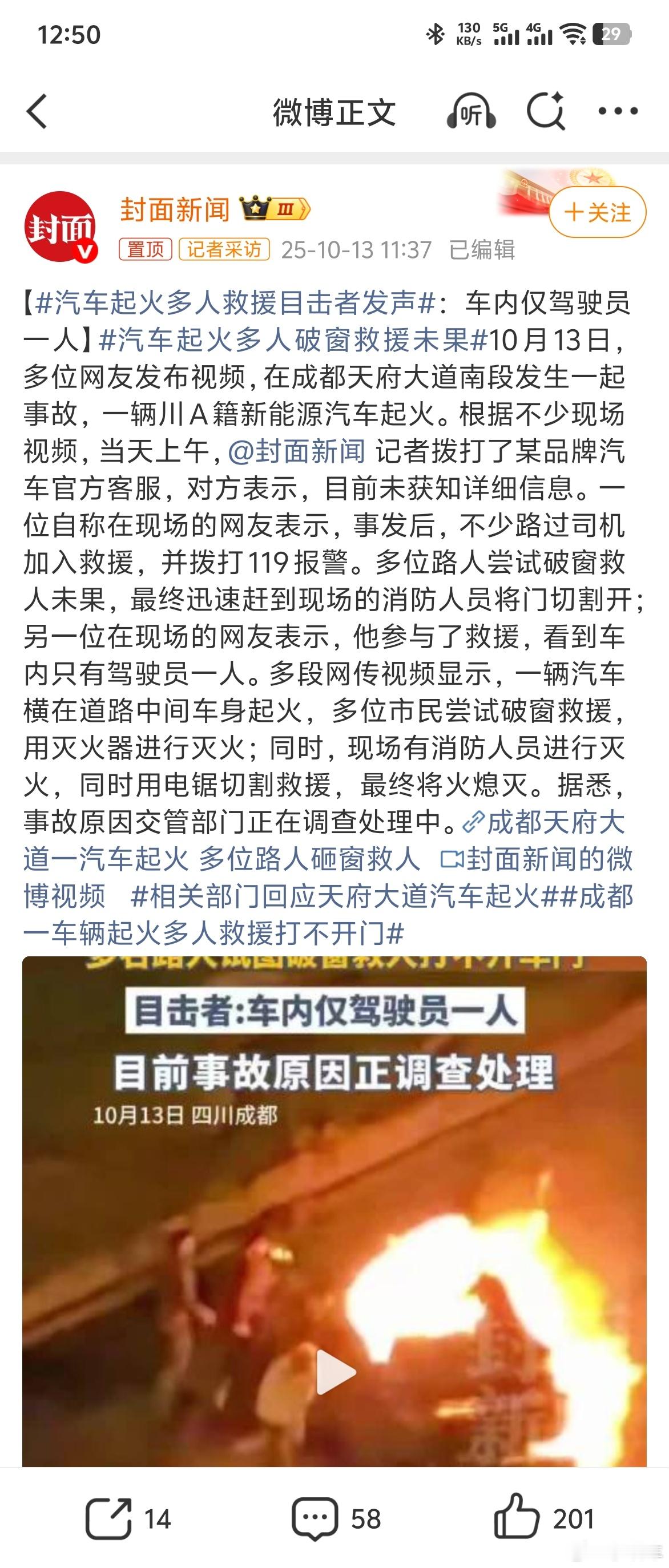 汽车起火多人救援目击者发声事故原因交管部门正在调查处理中,等有关部门的最终调查报告出来吧