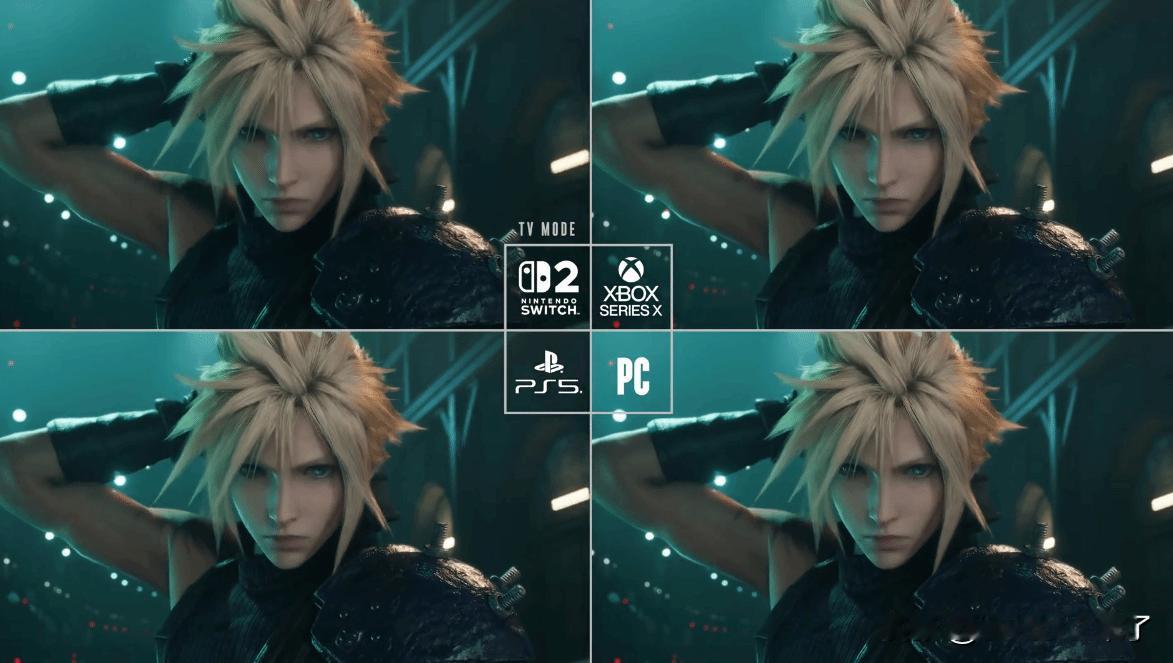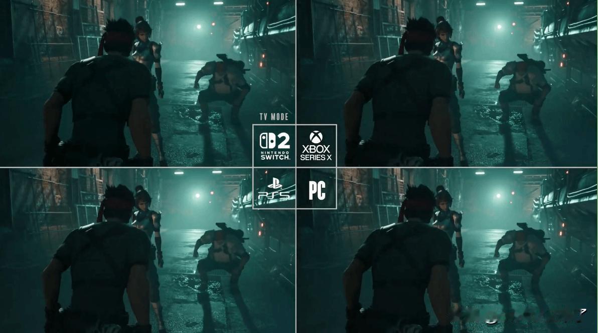 日前,史克威尔艾尼克斯发布了《最终幻想7:重制版Intergrade》的四家对比视频,演示了即将推出的NS2版与其他平台的对比,展示了游戏在 PlayStation 5、Xbox Series、PC和Switch 2平台上的运行场景。 据视频画面表现来看,即便NS2受硬件限制不及其他主机,但这段实时渲染画面,表现还不错。 SE此前已确认,《最终幻想7 重制版 Intergrade》将在Switch 2上以30帧运行。另一方面,PS5和 Xbox Series 版本则同时提供图形模式和性能模式,其中性能模式可以60帧运行。