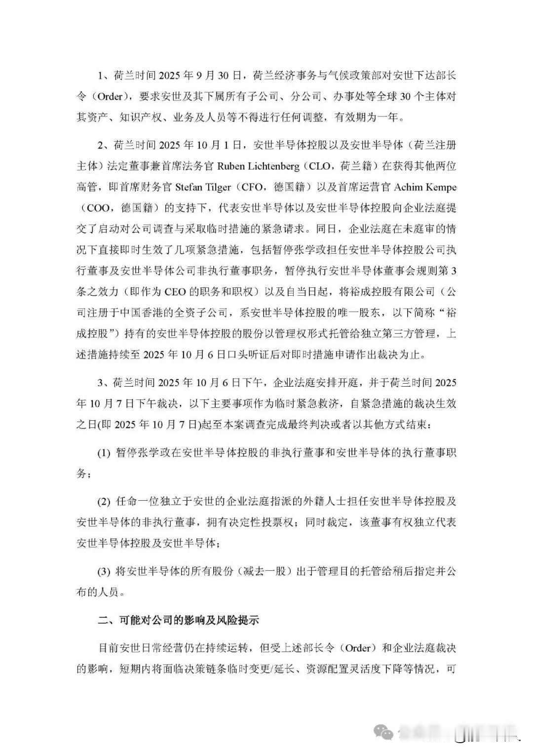 安世被冻结,张学政停职,谁在背后下刀? 9月30号,荷兰政府突然行动,冻结了安世半导体在全球的三十家子公司资产和知识产权的处置权,第二天,三名外籍高管联名申请紧急措施,10月7号,法院作出判决,要求中方CEO张学政暂停职务,公司股权交由第三方托管,并增设一名拥有否决权的外籍董事,这事一出来,公司里就乱了。 张学政是闻泰科技派去的,闻泰科技占了九成九的股份,安世半导体一年赚一百四十七亿,客户有博世、华为这些大公司,它原本是飞利浦的,二〇一八年闻泰花了二百五十亿买下来,现在日常运转还照常,但关键的事谁也做不了主,公司像被勒住了脖子,动不了。 很多人觉得这还是中资收购碰壁的老样子,其实不是,荷兰政府拿国家安全当借口,冻结了公司的运营权,法院再用法律程序,把中方管理层挤出决策圈,两边一配合,中国资本的控制权就被一点点掏空了,这根本不是普通的商业争执,是国家权力和资本力量在较劲。 那几个外籍高管不是普通员工,他们更像是在把守制度的门,他们提出转让股权,其实是想把公司从中国人说了算,改成欧洲人和国际资本一起管,这种事在德国、法国也见过,那边最近都在设外资审查机制,比如法国的黄金股,就是不让外国人完全控制关键企业。 闻泰自己也有责任,今年七月刚把手机代工业务卖了,转头全押在半导体上,董事会也换了人,把安世的高管调进来,本想好好整合,结果把在荷兰的缓冲带给拆了,文化没混到一块,制度也不熟,最后只能自己硬扛。 这事不光是中欧之间的事,安世做的车规芯片不是普通电子零件,它牵扯到汽车安全,属于关键基础设施,欧盟去年就讲过,功率半导体是战略物资,最近他们又要出新规定,从2025年3月开始,中国资本要是持股超过百分之二十五,又涉及半导体、AI这些领域,就得报批审查,安世这次,很可能就是新法出台前的一次试探。 有人问,安世内部是不是早就有矛盾,三个高管一起发难,不太可能是临时起意,他们可能早就对中方的管理方式不痛快,可闻泰一点都没准备,没设荷兰籍董事,也没建本地合规小组,他们以为买下公司就是老板,没想到欧洲人在乎的是治理主权。 现在事情还没完,荷兰会不会再扩大冻结范围,闻泰会不会找欧洲的机构来调解,中国政府会不会出面谈资本安全,这些问题都没人能说准,但有一点很清楚,中国高科技企业出海,不能再靠买下就等于控制的老办法了,真正的控制权,得看当地的。 这不只是闻泰一家的事,是所有想走出去的中国公司都躲不开的路,能在规则里站住脚的,才能活下来。欧洲芯片公司