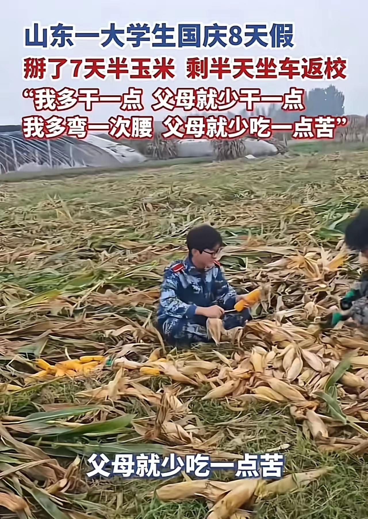 这个山东大学生火了!山东,男孩国庆8天假,掰了7天半玉米,剩半天坐车返校!他说:”,我多干点儿,父母就少干点儿,我多弯一次腰,父母就少吃一点苦!”网友:这样的孩子长大了肯定有担当有责任,肯定会幸福的。父母会少了很多辛苦! 这位山东的男孩,用他朴实无华的行动,点燃了无数人的心。或许有人会觉得,他只是在掰玉米、赶时间,但实际上,他用自己的方式诠释了什么叫“孝心”。在这个快节奏、压力重重的社会里,很多年轻人都在忙碌中迷失了方向,甚至忘记了父母的付出。而这个男孩,用简单的行动告诉我们:孝顺,不一定要轰轰烈烈的举动,它可以是每天的一点一滴,是在假期里用双手为父母减轻一点负担,是在繁忙中,给父母一个温暖的微笑。 他掰玉米的背影,也许普通得不能再普通,但那背后蕴藏的责任感,却令人动容。这不禁让人深思:我们是否也在某个角落,忽略了父母的辛苦?我们是否也可以像他一样,用行动去表达爱?在这个物质丰富、但精神常常迷失的时代,真正打动人心的,往往是那些看似微不足道的小事。 更令人感慨的是,这个孩子的父母,是普通的农民家庭,没有豪华的物质条件,但他们用朴实的生活教会了孩子什么叫责任、什么叫担当。正是这种家庭的温暖,孕育出如此懂事的孩子。或许,他的故事会激励更多年轻人,去关注身边的父母,去用实际行动表达感恩。因为,幸福其实很简单——那就是一家人在一起,彼此理解、彼此守护。 网友们纷纷点赞:“这样的孩子,未来一定有大作为!”“父母少操心了,有你真好!”“孝心不是一句空话,而是行动的坚持。”而更深层次的反思是:我们是否也应该像他一样,从自己做起,从小事做起,把孝顺变成一种习惯,让爱在点滴中传递。 这个山东男孩用行动告诉我们:责任感不是天生的,而是在生活中一点一滴积累起来的。未来,他也许会成为社会的栋梁,但更重要的是,他已经在用实际行动,诠释了什么是真正的担当。我们每个人都可以从他身上学到一课——那就是:在平凡中坚守,在细微中温暖。只要心中有爱,再平凡的事也能变得伟大。 所以,别小看那掰玉米的动作,也别忽略那份简单而纯粹的孝心。因为,这样的孩子,才是真正值得我们尊敬和学习的榜样。让我们都用心去感受,用行动去传递,让这个世界因为有爱而变得更加温暖。国庆回家大学生 山东大学生回村