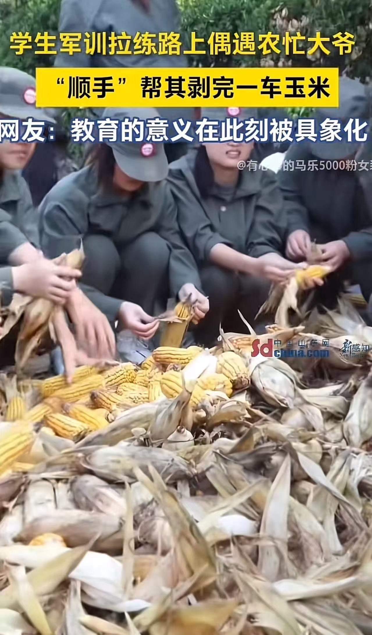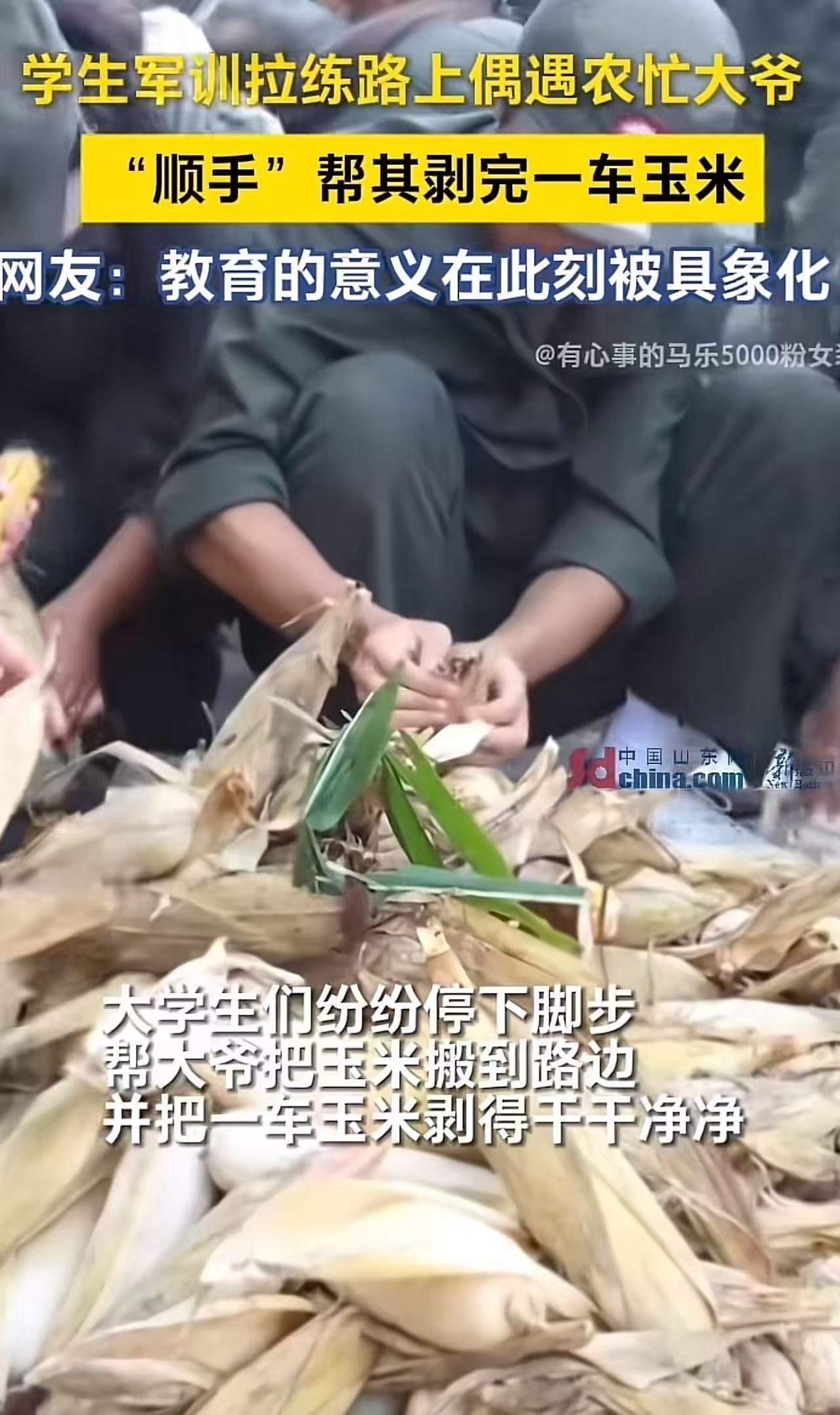 “这才是军训的意义!”河南开封,一高校新生军训外出拉练途中,遇到一位独自剥玉米的老人,学生们的行为,让老人泪目!网友:这不比在操场练站姿强百倍吗? 当我们在操场上反复练习着军姿、队列、口号时,也许很少有人会去想,军训的真正意义到底是什么。有人说,军训是锻炼意志、塑造品格的过程,但更深层次的东西,或许藏在那些不经意间的细节里。就在那天,一个普通的场景,让所有人都重新体会到:真正的军训,不只是动作的规范,更是做人、为人处世的修炼。 那天,正值烈日炎炎,学生们汗流浃背地步行在乡间的小路上。突然,远处传来一阵细碎的剥玉米声。学生们抬头一看,竟是一位满头白发的老人,独自坐在路边,专注地剥着玉米。没有人指引,没有人催促,他的动作娴熟而温和,仿佛与这片土地融为一体。学生们望着老人,心中泛起一股说不出的感动。 有人提议,停下来和老人打个招呼,甚至帮忙剥玉米。结果,几位学生真的走过去,递上了手中的水和食物,和老人聊起了天。老人笑着说:“我年轻时候也曾当过兵,那时候,军训就是为了锻炼我们吃苦耐劳的精神。今天,看到你们在烈日下坚持,我想起了自己年轻时的模样。”话语中,满是对年轻一代的期待和鼓励。 这简单的一幕,瞬间温暖了在场所有人的心。有人说,这不比在操场上练站姿强百倍吗?的确,真正的军训,除了让我们学习纪律、锻炼身体,更重要的是学会尊重生命、理解人生、感恩生活。那位老人没有多余的言语,却用行动告诉我们:坚韧、善良、感恩,是一名真正的军人应有的品质。 这个场景迅速引发网友热议。有网友留言:“比起死板的训练,更希望孩子们能学会用心去感受生活的美好。”也有人说:“这才是军训的真谛——学会做人,学会感恩,学会尊重生命的价值。”更有人感慨:“我们一直在追求速度和效率,却忽略了内心的修炼。或许,军训最重要的不是动作,而是心灵的成长。” 从这个角度看,军训不应只停留在表面的“硬技能”,更应该成为培养责任感、同理心和坚韧品质的过程。那位老人用剥玉米的动作,诠释了生活的智慧,也让我们反思:在快节奏的社会中,是否还记得那些最质朴、最宝贵的品质?是不是我们太过追求“效率”而迷失了“温度”? 也许,未来的某一天,当我们回望这段经历,会发现,是那份细腻的温情,教会了我们真正的坚强和勇敢。尊重生命,感恩生活,坚韧不拔,这些比任何形式的训练都更能塑造一个有温度、有担当的灵魂。 所以,下次再站在操场上练习站姿时,不妨想一想:你在追求什么?你希望成为怎样的人?也许,真正在成长的,不只是身体的硬度,更是心灵的厚度。让我们用心去体会,用行动去践行,让军训变成一场心灵的洗礼,一次生命的升华。 因为,最好的军训,不在于练出多少标准动作,而在于我们是否学会了用心去生活,用爱去感受这个世界。