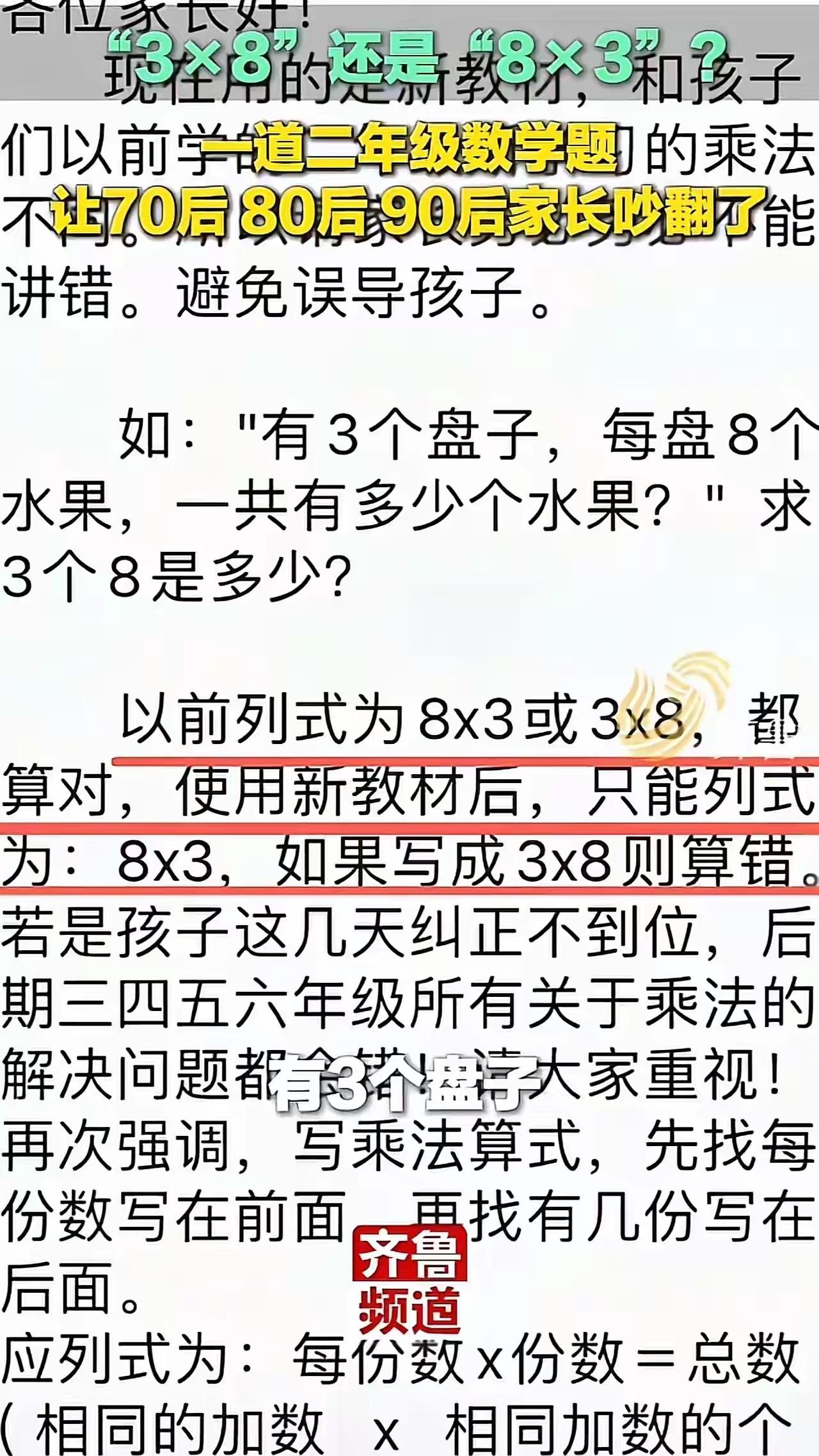 最近,一道小学二年级的数学题让70后、80后、90后的家长吵翻了!到底是3×8还是8×3?家长:“我们小的时候没问题,教老大的时候也没问题,教老二为什么却不行了? 这道简单到几乎不用思考的数学题,却引发了无数家长的“集体崩溃”。70后、80后、90后都纷纷表示:“这不是数学的问题,是时代的问题!”有人说:“我们小时候学的乘法,讲究的是算数的逻辑和心算的习惯,怎么到了现在,连简单的乘法都成了难题?”有人更是感慨:“难道是我们被“死记硬背”养成的思维,已经跟不上新一代的学习节奏了吗?” 其实,这背后折射出的是一个更深层次的社会变迁——教育在不断变化,家庭教育也在无形中发生着巨大转变。我们曾习惯于“教孩子记公式”,强调“背诵和重复”,但如今,信息爆炸的时代,知识的传递方式早已不同。孩子们面对的不再只是书本上的公式,更是海量的碎片信息、多样的学习工具和丰富的学习场景。 这道题的不同答案,不仅是数学的差异,更是认知方式的不同。3×8和8×3,答案都一样,但考察的角度和思维方式却大不相同。传统的家长习惯于“固定的思维模式”,追求“唯一的正确答案”,而新一代孩子们则更倾向于“多元思维”和“创新理解”。他们学会了用不同的角度看问题,用不同的方法解决问题,这才是真正的素养。 令人欣慰的是,这场“数学题风波”也让许多父母开始反思:我们是不是过于强调“结果”,忽略了“过程”?是不是应该给孩子更多的空间去探索、去质疑,而不是一味地灌输答案?正如那句老话:“教育的本质,是激发孩子的潜能,而不是填鸭式的灌输。”我们应该用更开放的心态,去理解孩子们的成长方式,尊重他们的思维多样性。 同时,这也提醒我们每一位家长,不能只盯着成绩和答案,更要关注孩子的学习过程和成长心态。让孩子在不断尝试、不断失败中找到自信,在探索中学会独立思考。毕竟,未来的社会需要的是具有创新精神和批判性思维的人才,而不是只会死记硬背的“答案机器人”。 这场“数学题风波”或许只是一个小插曲,但它折射出的教育理念变革,值得我们每一个人深思。面对变化的时代,我们不能固步自封,更不能用旧的方法去衡量新一代的成长。只要我们愿意去理解、去包容,去引导孩子们用自己的方式去理解世界,我们就能共同迎来一个更加充满希望和可能的未来。 那么,你怎么看待这场“数学题风波”?是孩子们的“新思维”在挑战传统,还是我们还没有跟上时代的脚步?留言告诉我,让我们一起为教育的未来喝彩,为孩子们的成长点个赞!