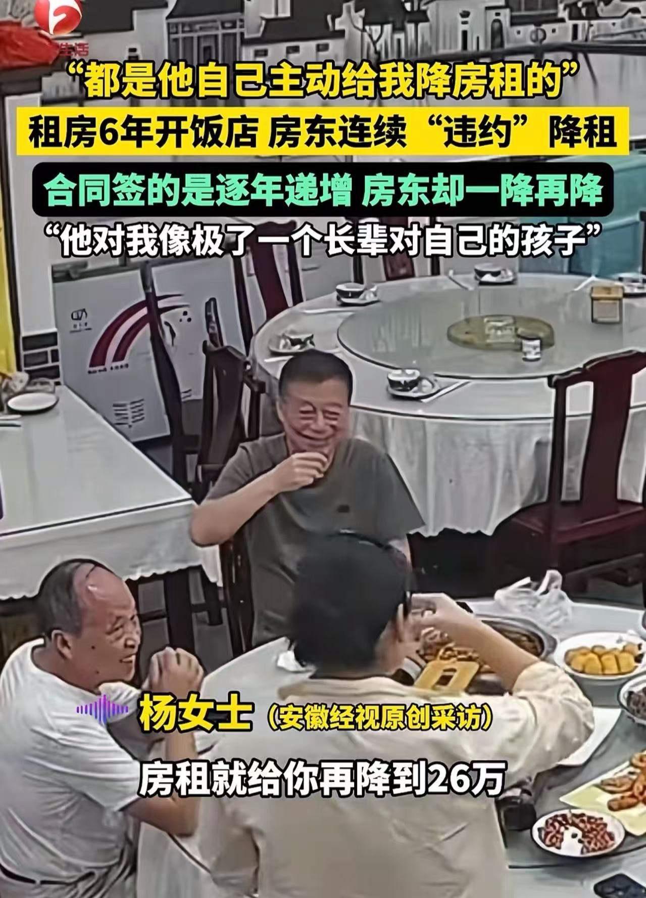 “这个房东大爷,给全网的房东上了一课!”安徽合肥,女子开饭店租金30万一年,合同签的是房租逐年递增,但万万没想到,房东大爷连续“违约”,把房租一降再降。网友:我想把这视频转发给我门市的房东…… 故事的背后,藏着太多我们熟悉的“房东困境”和“租客心声”。很多人都在想:房东为什么会突然反转?是不是觉得自己也“被套路”了?其实,这场“逆转”,更像是一面镜子,照出了人性最真实的一面——在利益面前,谁都可能变得更有人性一些。 你是否也遇到过类似的烦恼?明明签好的合同,按照约定要逐年递增,结果房东大爷却一再“违约”。这或许让你愤怒、失望,但更让人深思的是:在这场利益博弈中,谁才是真正的赢家?是坚守合同、守诚信的租客,还是在利益面前愿意“让步”的房东?答案似乎并不那么简单。 有人说,这位大爷的行为像极了“逆袭的英雄”。面对“合同陷阱”,他选择了逆向操作,用降价的方式“赢得”了网友的心,也赢得了更多的尊重。不要忘了,真正的智慧,不在于一味争斗,而在于懂得变通、懂得站在对方的角度思考。 而这,不正是我们每个人都需要学会的生存之道吗?在这个充满不确定的时代,灵活应变、善于沟通,比死死守住“规则”更重要。房东大爷的“逆转”,其实也是一种智慧——在坚持原则的同时,懂得人性中的柔软与妥协。 当然,很多网友都在评论区纷纷留言:是不是以后我们也该像这位房东大爷一样,学会用“善意”去打破“僵局”?其实,这正是人性最美的一面。善意,常常能在不经意间化解矛盾,赢得尊重和信任。 这件事情告诉我们:在利益纷繁的社会中,坚守诚信固然重要,但更重要的是,懂得在合适的时机用宽容和智慧去应对挑战。只有这样,我们才能在复杂的人际关系中,找到一条更长远、更稳固的道路。 更何况,房东大爷的“逆转”也提醒我们:在这个社会,谁都可以“逆风翻盘”。只要我们保持善意,懂得变通,就没有赢不了的局面。未来的路上,或许我们都可以从这个故事中汲取一点温暖与力量——用理解和包容,去破解生活中的“难题”。 所以,下次遇到“合同陷阱”或者“利益冲突”,不妨想想这个“逆转的房东大爷”。或许,我们都可以成为那一个,既坚守原则,又懂得变通的人。毕竟,人生不就是一场不断学习、不断成长的旅程吗?在这条路上,带着善意前行,总会有意想不到的美好等待着我们。