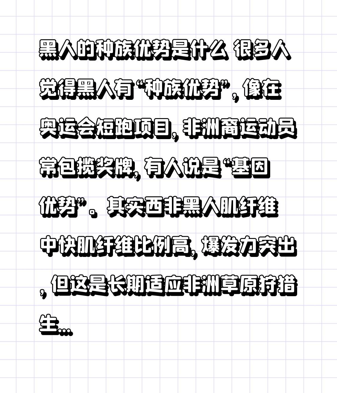 黑人的种族优势是什么 很多人觉得黑人有“种族优势”,像在奥运会短跑项目,非洲裔运动员常包揽奖牌,有人说是“基因优势”。其实西非黑人肌纤维中快肌纤维比例高,爆发力突出,但这是长期适应非洲草原狩猎生活,需快速奔跑追捕猎物,一代代演化的结果,就像北欧人擅长滑雪是环境塑造。 音乐上,从爵士到嘻哈,黑人创造力惊人。这源于非洲传统口头文化,靠歌谣传历史,节奏韵律融入生活,音乐成了文化基因。 但别把“擅长运动”“会唱歌”当黑人全部标签。库里精准投篮、托妮・莫里森文学成就,都打破了偏见。要警惕“优势论”成新偏见,正视个体差异。