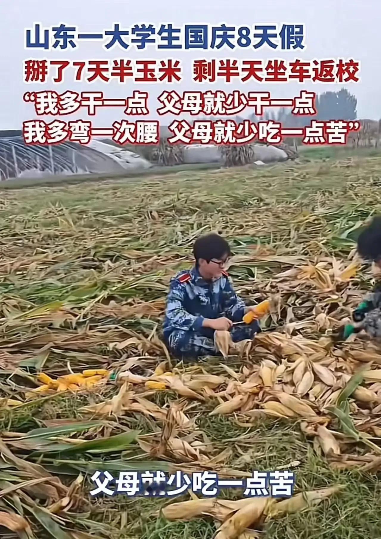 这个山东icon大学生火了!山东,男孩国庆icon8天假,掰了7天半玉米,剩半天坐车返校!他说:”,我多干点儿,父母就少干点儿,我多弯一次腰,父母就少吃一点苦!”网友:这样的孩子长大了肯定有担当有责任,肯定会幸福的。父母会少了很多辛苦! 他用行动告诉我们,责任和孝心其实可以很简单,也可以很伟大。在这个快节奏、压力山大的时代,他用“掰玉米”的方式,诠释了什么是真正的孝顺与担当。八天假期,他只休息了半天,剩下的时间都在忙着“劳动”,用自己的双手为家人减轻负担。这样的行为,瞬间点燃了无数人的心。 很多人或许会觉得,这只不过是个普通的假期劳动,但细细品味,却能看到一份深沉的爱与责任。或许有人会问:“他为什么要这么拼?”答案其实很简单——因为他知道,父母的辛苦不是天经地义的,而是用爱和汗水换来的。每一次弯腰,每一颗玉米的收割,都在告诉父母:“我长大了,我懂得感恩。”这不只是一份孝心,更是一份对生活的尊重和对未来的责任感。 网友们纷纷点赞:“这样的孩子,未来一定有担当。”有人说:“他用行动告诉我们,孝顺不是口号,而是日常的点滴。”也有人感慨:“父母少了很多辛苦,这才是真正的幸福。”这让我不禁思考,现代社会到底缺少了什么?也许,是一些人忘了“孝”的真谛,忘了那份最朴实的爱。而这位山东男孩,用实际行动告诉我们,孝顺不需要轰轰烈烈,它就在每一个细节里,就在每一次弯腰的瞬间。 其实,孩子的成长,最希望的不是物质的富足,而是父母的笑容和安心。这个假期,他用“掰玉米”的方式,传递了最温暖的家庭价值观。或许,我们每个人都可以从他身上学到一些:在快节奏的生活中,别忘了停下来,用一份真心去关爱身边的人。毕竟,幸福不在于拥有多少,而在于懂得感恩、懂得付出。 让我们为这个“掰玉米少年”点赞,也希望更多的年轻人能像他一样,用行动诠释责任与爱。在未来的日子里,让我们都成为那个“用心生活,用爱前行”的人。因为,真正的幸福,就是在平凡中坚守那份不平凡的责任和温暖。大学生回村干活 国庆回家大学生