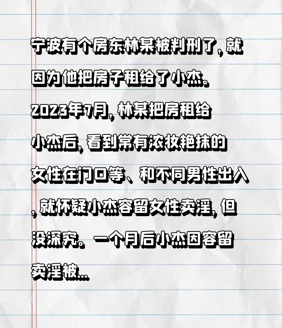 宁波有个房东林某被判刑了,就因为他把房子租给了小杰。2023年7月,林某把房租给小杰后,看到常有浓妆艳抹的女性在门口等、和不同男性出入,就怀疑小杰容留女性卖淫,但没深究。一个月后小杰因容留卖淫被抓,租房暂停。2024年9月,小杰刑满释放,林某主动问他是否租房,又把空置房租出去,还明知小杰用房子容留卖淫,还让小杰做好日常管理。2025年5月的报警让林某的罪行暴露,2025年8月,他因容留卖淫罪被检察院起诉。这房东真是糊涂,明知道租客干坏事还纵容,这下自食恶果了。