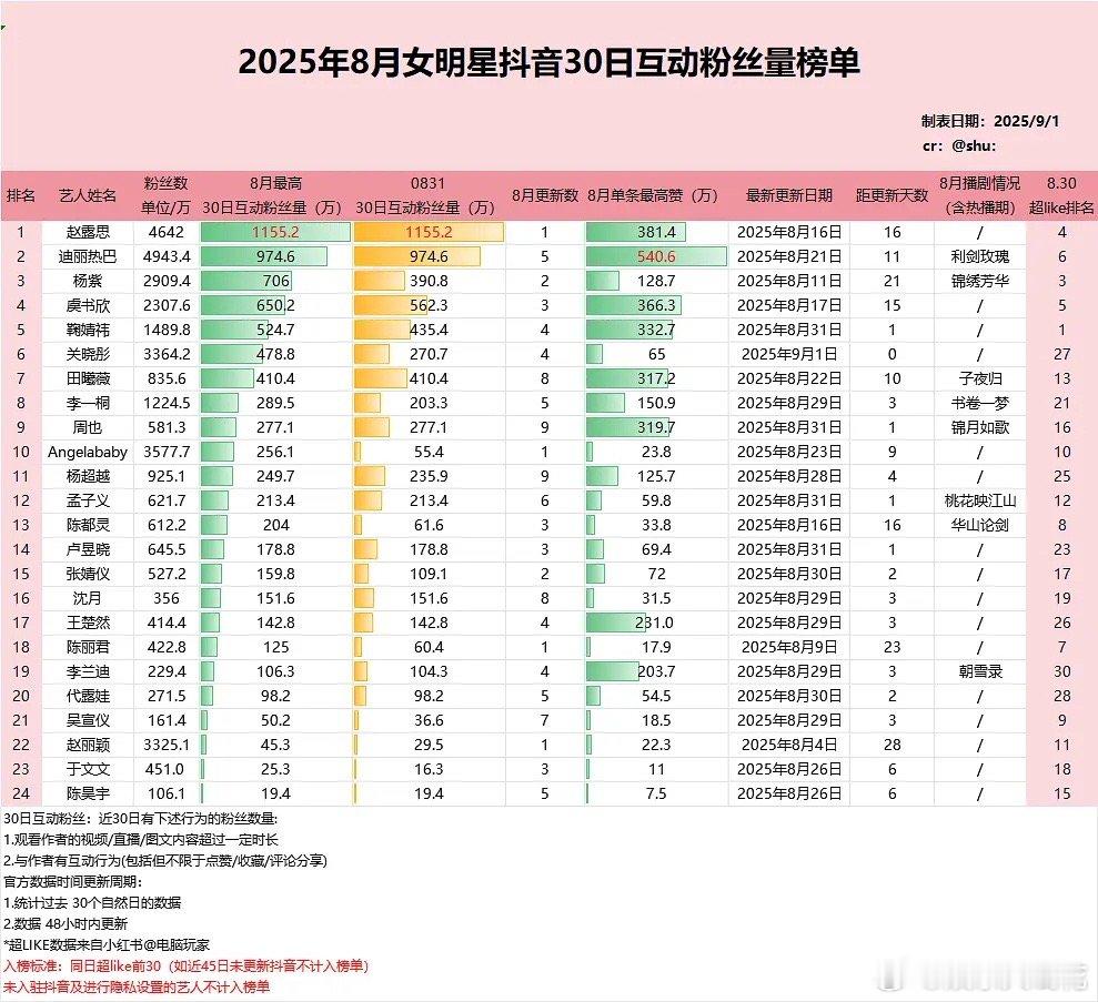 赵露思抖🎵近30日互动粉丝2153万🤯剧爆人爆实感!在8月份1155万的基础