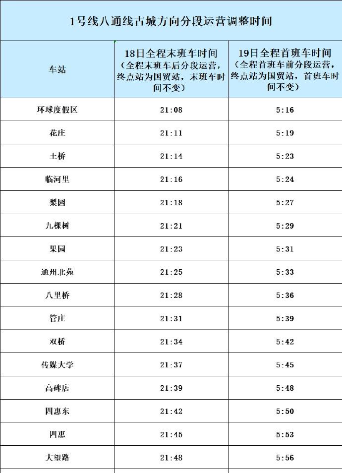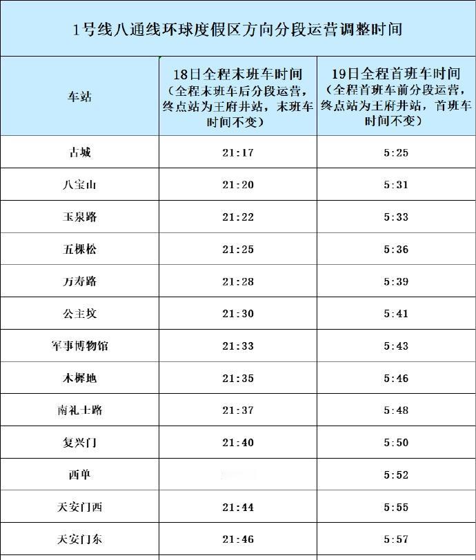 【北京地铁 北京地铁1号线因施工一天夜晚将影响1-2小时】北京地铁: 为配合1号线道岔设备施工改造,2025年10月18日22时至2025年10月19日6时,地铁1号线建国门站、东单站、永安里站封闭,换乘站停止换乘,2号线建国门站、5号线东单站保持运营;地铁1号线八通线分段运营,运营区段调整为古城-王府井、国贸-环球度假区,古城站开往环球度假区站方向的列车终点站调整为王府井站,环球度假区站开往古城站方向的列车终点站调整为国贸站。