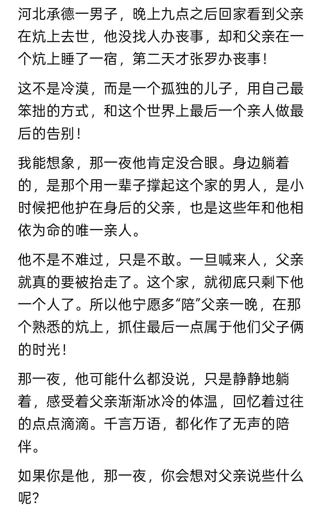​​如果你是他,那一夜,你会想对父亲说些什么呢? 看到有网友分享一个故事,说是河北的一男子发现父亲过世,并没有声张,而是躺在父亲旁边,陪伴了一夜,等到第二天的时候才通知了其它人。 很多网友都被他的孝心打动,认为那一夜他肯定没睡,之所以没通知是因为知道一旦通知父亲就会被抬走,所以才有自己的方式陪伴最后一程。 我不知道大家那边的习俗是怎么样的? 按理说去世后就要立马告知乡村的人过来安顿,我们这边是要在家里待七天。 先是给家里搭一个简易床,然后替收拾好。等过两天亲戚朋友都来了,然后正式入殓,换好衣服放到丧葬专门用的冰柜当中,等到日期才会正式安顿下葬的事情。