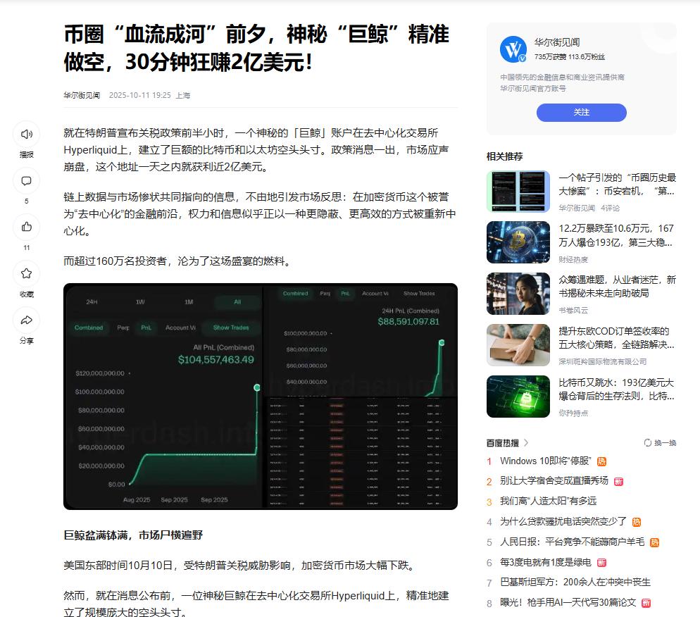 特朗普宣布对中国提高关税的30分钟前,一位巨鲸开设了大量杠杆空头仓位。在一天之内,这位巨鲸从加密货币市场崩盘中获利1.92亿美元。 这一切是不是特朗普家族在暗中交易? 要说特朗普家族没在这事儿里搞事,鬼都不信!要知道,加密货币本就是靠消息和预期驱动的投机市场,一点风吹草动就能引发暴涨暴跌,而特朗普的关税政策向来是能让全球市场抖三抖的重磅炸弹,两者碰撞必然掀起巨浪。 说不定特朗普家族早就在加密货币领域布好了局,毕竟公开数据显示他们涉足非同质化代币、比特币挖矿、发行个人加密货币等业务,光账面收益就接近10亿美元,还通过持有加密货币平台股份赚了5736万美元,这笔钱可都是从市场里捞来的,他们比谁都清楚关税消息能给加密货币带来多大冲击。 而且特朗普身边这群人的操作套路,早就把“政策变现”玩得炉火纯青。司法部长帕姆・邦迪在特朗普公布“对等关税”的当天出售了价值百万美元的股票,成功避开随后13%的跌幅;交通部长肖恩・达菲更精准,在关税宣布前两天就抛售了30家公司股票,事后只拿“客户经理操作”当挡箭牌。 特朗普自己也没闲着,曾在社交媒体喊话买入后,立刻宣布暂停部分关税,旗下公司股价当天就大涨20%,还得意地炫耀富豪朋友们赚了几亿美元。 连纳斯达克都监测到,在他宣布暂停关税前几分钟,电话交易量突然激增,这种“巧合”在他的圈子里简直成了常态。 关税和加密货币暴跌的因果关系早就有实锤。4月7日特朗普宣布“对等关税”后,全球迎来“黑色星期一”,比特币直接下跌5%,24小时内28万人爆仓,全球市场市值蒸发超5.4万亿美元。 要知道加密货币对宏观政策尤其敏感,特朗普3月6日签署设立加密货币储备的行政令,没提买入要求,比特币当天就跌到8.65万美元;而他说一句“我爱特朗普币”,这币种立马暴涨10%。 这种被政策牵着鼻子走的市场,提前30分钟知道关税消息,就等于拿到了印钞机的钥匙,开空头仓位简直是稳赚不赔。 更关键的是特朗普家族和加密行业的利益捆绑早就摆上台面。上届政府对加密货币严监管,特朗普刚参选就立刻转变态度,从骂加密货币是“骗局”变成喊着要让美国成“比特币超级大国”,背后是加密行业通过超级政治行动委员会砸了1.3亿美元政治捐款。 他上任后不仅开白宫加密货币峰会,还提名自己人当“加密沙皇”,把XRP、Solana这些币种纳入储备,每一步操作都在给市场释放信号,说白了就是拿国家政策给加密资产站台。连提名亲家当高级外交官这种明显的裙带关系都敢做,泄露点关税消息给“自己人”开仓位赚钱,对他们来说根本不算事儿。 那些说“巧合”的人,要么没见过真正的市场规律,要么就是故意装糊涂。巨鲸要在30分钟内完成大量杠杆空头仓位的开设,需要精准的消息时间点和充足的资金准备,普通人根本不可能有这本事。 而特朗普家族一边握着关税政策的决策权,一边在加密货币市场有上亿资产,这种双重身份下的“时间差获利”,本质就是把白宫当成了私人交易室,把公权力变成了提款工具。 之前十几名政府高官在关税政策前精准交易都没个说法,这次加密货币市场的1.92亿美元获利,不过是他们众多操作里被曝光的冰山一角而已。