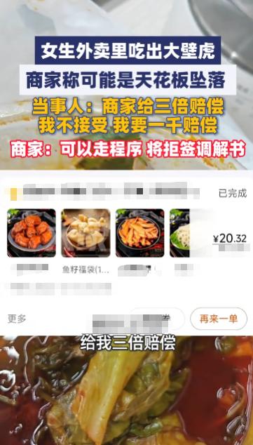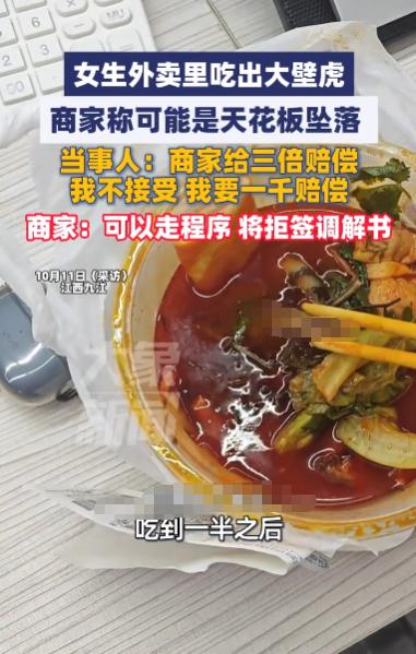 “离了个大谱!”10月11日,江西九江,一女子吃外卖吃到一半,竟然发现碗里有一只煮熟的大壁虎,这可把女子恶心坏了,网友:这要是不小心吃了,估计得留一辈子心理阴影! 现在很多人没时间做饭,吃饭就选择点外卖解决,可这些外卖餐食的制作环境令人意想不到,时不时可能会给顾客来个“加餐”。 一女子点了份麻辣烫外卖,外卖送到后,饥肠辘辘的她打开赶紧开吃,吃到一半时,女子发现碗里好像有个奇怪的东西,用筷子夹起来一看,这居然是一只大壁虎! 这只壁虎已经被煮熟,明显是制作过程中掉到锅里的,这就意味着女子吃下去东西都和这只壁虎一起炖煮过,这可把女子恶心坏了,她将这只壁虎拍下照片发给了商家,要求赔偿。 商家解释这只壁虎可能是从天花板掉到锅里的,他们可以给到三倍补偿,这么点钱女子无法接受,提出1000元赔偿,被商家拒绝,表示女子可以走程序,自己一定会拒签调解书。 不少网友直呼恶心,显然这不是商家第一次处理这种事,言语中可以看出他对流程十分熟悉,已经是个“老油条”,不管处理结果如何,都能看出现在外卖小店的卫生条件堪忧,在点餐时尽量注意了! 信息来源:《女生外卖里吃出大壁虎,商家称可能是天花板坠落》大象新闻