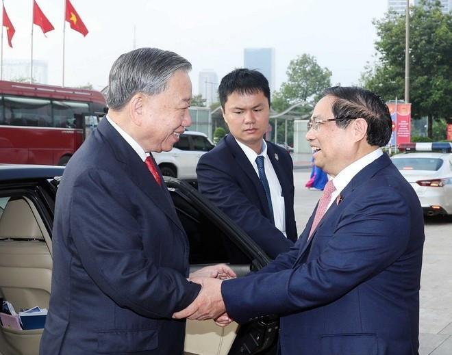 范明政亲自迎接苏林,两人面带微笑双手紧握,这是今天上午发生的一幕,范明政领导的政府系统正在开一场前所未有的新大会,那就是第一次政府系统党代表大会,苏林到场祝贺,出席会议的还有主席梁强、议长陈青敏和常务书记陈锦秀,卸任领导农德孟、张晋创、阮晋勇、阮生雄和阮氏金银也出席了。 苏林1957年出生,2021年换届时担任局委兼任公安系统一把手,2024年接任病逝的阮富仲出任越南一把手。 范明政1958年出生,2021年换届时担任内阁宰相。 2026年1月份越南将开大会换届,预料苏林和范明政将会留任。