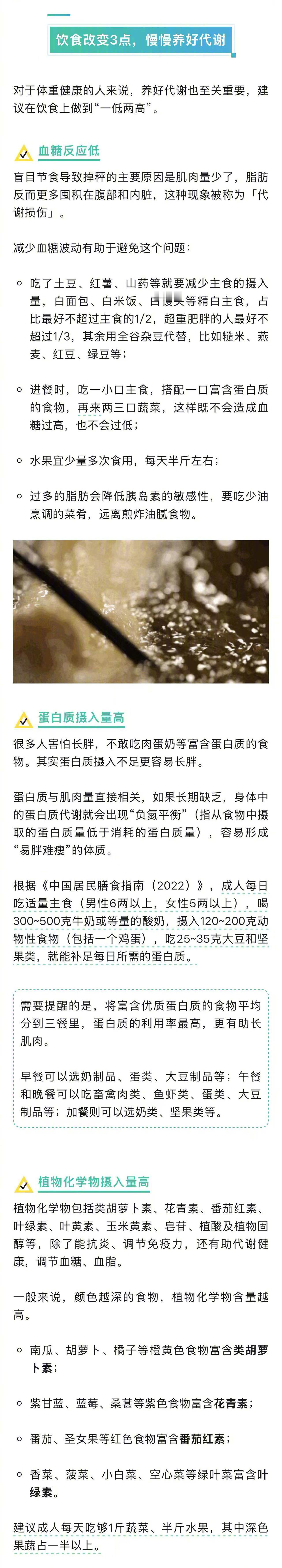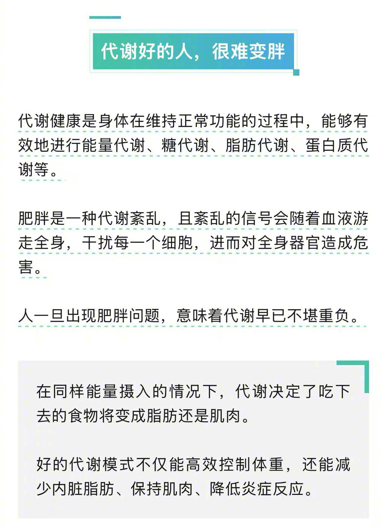 硬核研究所 【你不是瘦不下来而是代谢慢了】肥胖,本质上是一种代谢紊乱,且紊乱的信号会随着血液游走全身,干扰每一个细胞,进而对全身器官造成危害。代谢好的人很难变胖,好的代谢模式不仅能高效控制体重,还能减少内脏脂肪、保持肌肉、降低炎症反应。 (生命时报)