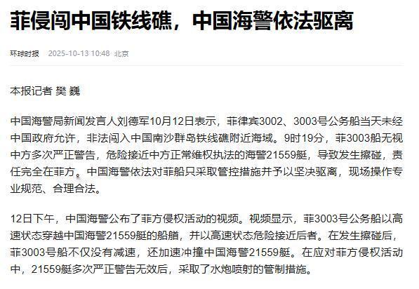 从直升机吹翻,到水炮压制,再到今天的船体冲撞。10月12日,在铁线礁海域,中国海警用一次比一次更强硬的手段,教菲律宾“学规矩”。马尼拉似乎还没明白,每一次挑衅,换来的只会是更猛烈的铁拳。 在这场对峙中,菲方派来的3002、3003号公务船看着唬人,实则3002号“达图・桑代”号不过是艘170吨的近海巡逻船,2022年才服役就忙着闯南海,2023年闯黄岩岛被水炮浇过,2024年8月闯仙宾礁撞过中方21551艇,堪称“南海惯犯”。 而中方出动的21559艇,早就在仁爱礁、半月礁一线的“多层次拦截圈”里练过手,对付这种老油条式的挑衅门儿清。 从过程看,中方的应对堪称“梯度升级教科书”。先是高压水炮压制,这招早有先例,8月菲方闯仙宾礁时,中方就用水炮逼退过同款船只,只是当时菲方没当回事。等到9时19分菲3003号高速冲过来,甚至在擦碰后还加速顶向21559艇,中方才动用船体冲撞,这完全是按《海警法》里的“必要管控措施”来的,专业规范得挑不出错。 菲方事后还想装受害者,却忘了自己船小力弱,170吨的身子板撞向中方千吨级海警艇,纯属“以卵击石”,这种炒作连国际舆论都骗不了。 若往前倒推几个月,就能看清这场升级早有伏笔。8月份仅一个月,中国海警局就针对菲方挑衅发了7次谈话,8月19日更是一天三次发声,连放两条菲船故意冲撞的视频,当时中方还用无线电警告、航路管制等手段留着余地。 可菲方反而变本加厉,8月28日派直升机往仙宾礁非法滞留的船上空投物资,以为玩“空中突袭”能占便宜,结果被中方全程跟监,物资根本没送到位。 到了9月,菲方又在黄岩岛附近反复滋扰,中方加强巡查后,他们转头就把主意打到了铁线礁——这片距离渚碧礁仅17公里的战略要地,能和渚碧礁形成掎角之势,是封锁中业岛的关键支点,菲方惦记着在这建永久设施,才一次次铤而走险。 菲方敢这么折腾,说白了是算着两本账:一本是国内政治账,马科斯政府面对动荡政局,想靠南海议题转移民众注意力;另一本是外部投机账,跟着美国的指挥棒搞“多点挑衅”,以为能借域外势力给中方施压,甚至想靠冒险行径吸引“国际关注”。 可他们忘了,中方在南海的执法体系早不是几年前的规模,从卫星监控到海警船常态化巡逻,菲方船队刚从布利卢延港出航,动向就被摸得一清二楚,8月在半月礁更是把菲方补给船队拦在100公里外,连仁爱礁的边都没摸着。 这次铁线礁对峙,中方敢直接撞击,就是吃准了菲方的底牌——除了喊口号、拍视频炒作,根本没有实质对抗的实力。 铁线礁的战略价值,才是双方博弈的核心。这片礁盘距离中业岛极近,又和渚碧礁形成呼应,中方管控住这里,相当于给南沙群岛的海防体系补了块关键拼图,菲方要是真在这搭了设施,等于在中方防线里插了根钉子。 也正因如此,中方的回应才一次比一次硬:从最初驱离渔船,到水炮拦截,再到如今的船体冲撞,每一步升级都对应着菲方挑衅的加码。 菲方以为中方会怕“事态升级”,却没明白中方的底线——主权问题上没有妥协空间,《南海各方行为宣言》里写得明明白白,非法闯入就得受罚,他们去年签的仁爱礁运补临时安排都能撕毁,中方自然要拿出更硬的手段立规矩。 更有意思的是菲方的“战术误区”,总觉得派老船、装媒体记者就能博同情。3002号船去年撞中方21551艇时就带着记者跟拍,结果视频里清晰可见是菲船主动变向冲撞,反而坐实了挑衅罪名。这次3003号故技重施,高速穿越大海警船船艏,简直是把“故意挑事”写在了船身上。 中方海警早就摸透了这套把戏,21559艇的每一次警告都录了音、拍了像,连碰撞的角度、位置都有数据记录,菲方想耍赖都没地方找补。 说到底,菲律宾至今没搞明白,中方的“强硬”从来不是心血来潮,而是对“反复挑衅-轻微警告-变本加厉”循环的精准反击。从8月仙宾礁的水炮到10月铁线礁的冲撞,中方的回应力度始终跟着菲方的挑衅等级走,越界一次就加码惩罚。 菲方要是还抱着“靠碰瓷博关注”的心思,下次面对的可能就不只是船体冲撞了——毕竟中方海警的执法工具箱里,能拿出来的手段可比这多得多。