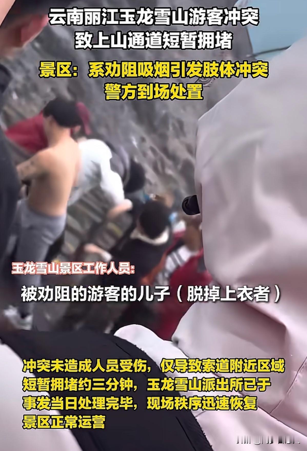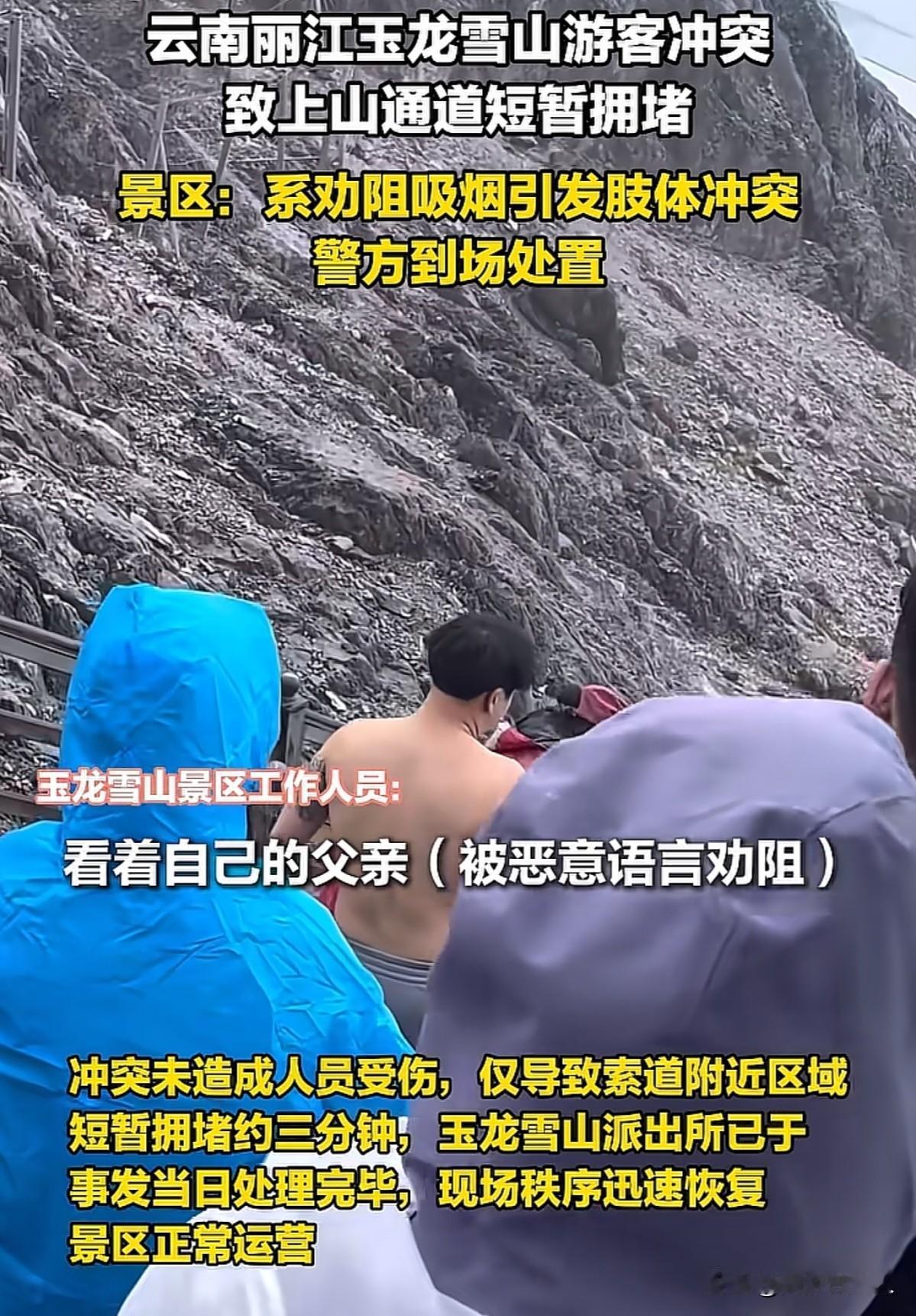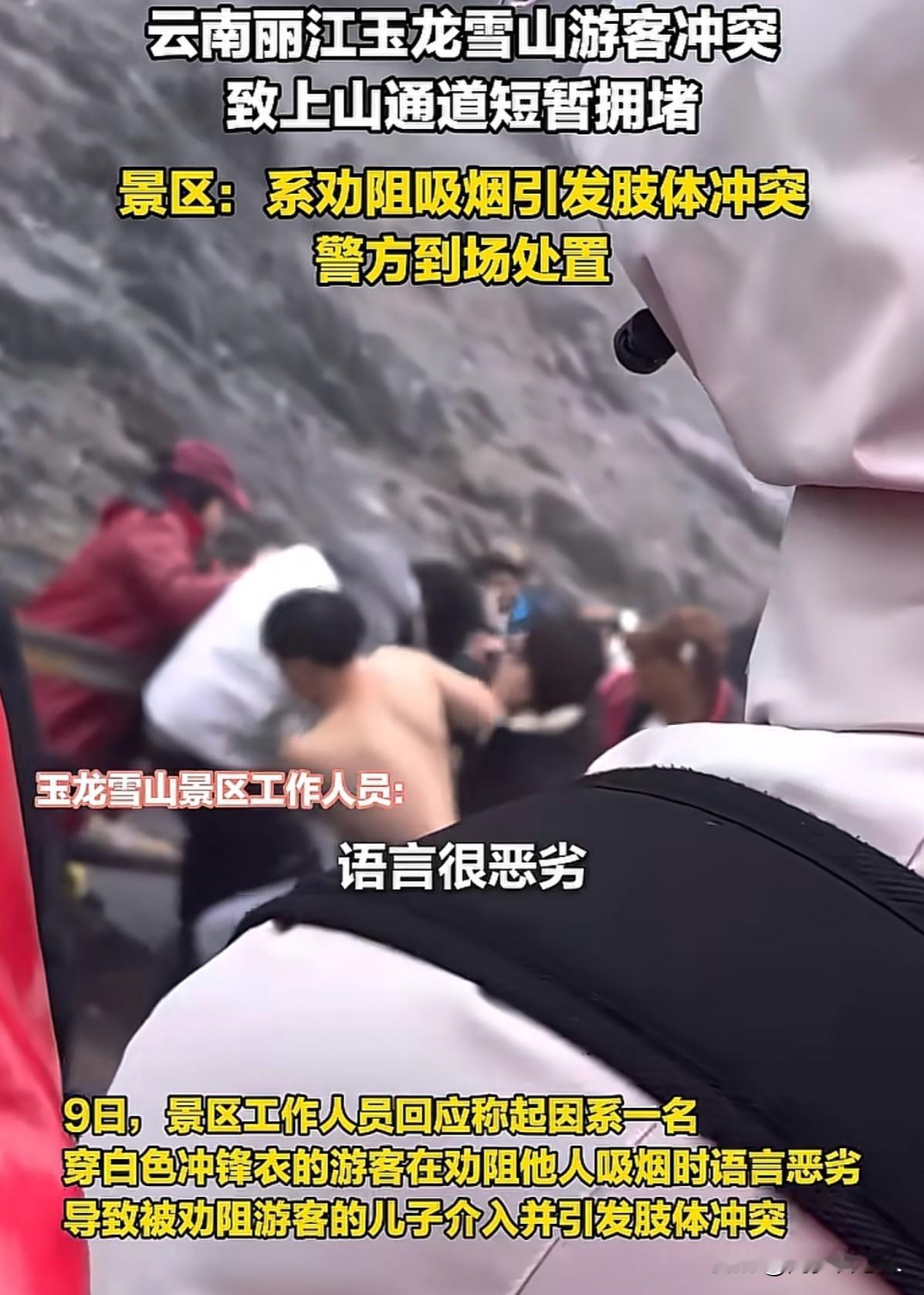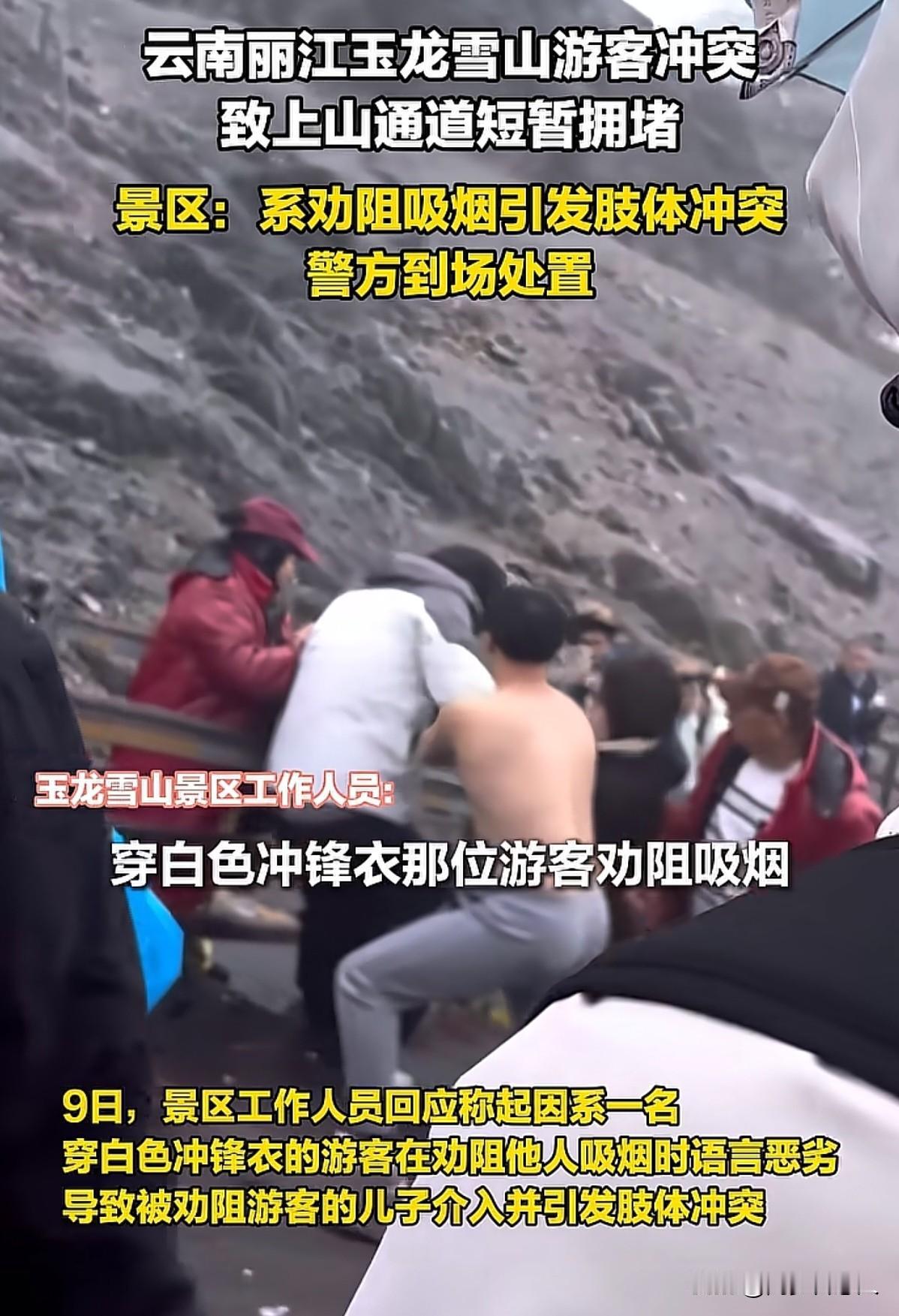 在野外山上抽烟却遭他人恶劣的语言劝阻,这次踢到铁板了,被劝阻吸烟他的儿子就在旁边,双方发生了肢体接触! 劝阻吸烟的视频,这段时间在网上经常刷到,有人专门拍此类视频起号。 有些拍劝阻吸烟的人,所找的对象,都是年龄较大,或者身体瘦弱,所使用的语言以及语气,让旁人都听的很不舒服,感觉就是故意用那样的语气,想让更多的人去评论他的视频。 终于这次有人就踢到铁板了,他也是用恶劣的语言去劝阻一个老实的中老年人,结果没想到人家年轻的儿子就在身边。 景区野外大雪山,沿途路上的垃圾箱上方也设有灭烟盒,在这样的环境下,想不让别人吸烟,语气应该委婉一些,毕竟不是室内禁烟区。 这个用恶劣语言劝阻吸烟的人,他已经涉嫌蓄意挑衅了!