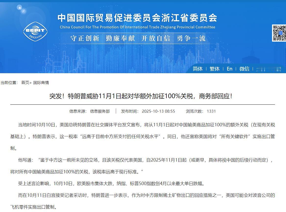 中国点名对美国进行回应!在特朗普扬言要对我们加征100%的关税之后,我们商务部作出了两个重要回应!10月12日,我们的商务部表示,其一,若美国一意孤行,中国必将采取反制措施。其二,我们严正表示,9月中美马德里经贸会谈以来,短短20多天时间,美方新增出台一系列对华限制措施,影响中方数千家企业,这种严重破坏双方经贸会谈氛围,中方对此坚决反对。 很显然,对于特朗普的威胁,我们的回应就是把话挑明了 —— 早把美方那套 “虚空造牌” 的套路看穿了,没必要再绕弯子。特朗普扬言加征 100% 关税,听起来唬人,但稍微扒拉一下历史就知道,这不过是美方的老戏码,只是这次演得更急了点。 商务部特意点出 9 月马德里会谈后 20 多天美方的操作,可不是随便提一嘴,这背后全是实打实的账。美方嘴上说着谈合作,转头就新增一堆限制措施,又是把中国实体塞进管制清单,又是用所谓的穿透性规则扩大打击范围,一下就影响了中方数千家企业,连海事、物流这些跟 “国家安全” 八竿子打不着的行业都没放过。 这就好比刚握完手说要一起吃饭,转身就把对方的餐具全摔了,这种操作放在任何谈判里都是砸场子,中方要是还跟没事人一样客气,那才是真傻。 而且美方这套 “出尔反尔” 的功夫早有前科,远的不说,2018 年中美刚达成 “不打贸易战” 的共识,才过 10 天美方就翻脸要加关税,之后又反复横跳好几次,把谈判当儿戏。 这次更离谱,手里的管制清单都攒到 3000 多项了,比中方的清单多了两倍还不止,甚至搞出 “0% 最低含量” 的规则,简直是为限制中方量身定做的霸王条款。说白了,美方就是想靠耍横逼中方让步,但他们忘了,现在的中国早不是能随便拿捏的了。 再说特朗普叫嚣的 100% 关税,真要是落地,先疼的其实是美国自己。之前杜克大学的调查早算过账,美国企业三分之一的涨价都得怪关税,要是没这些关税,通胀早就能回到美联储 2% 的目标线了,哪还用得着天天担心滞胀。 更讽刺的是,美方一边喊着加关税,一边自家企业却在偷偷叫苦,苹果、高通这些巨头在华的利润空间被政策压缩,不少美企只能眼睁睁看着中国市场被别人抢走。毕竟中国量子市场里四分之三的投资都来自本土,美方的限制措施说白了就是给自己企业挖坑。 中方说 “必将反制” 也不是放空炮,这些年早被美方逼出了底气。当年美方卡华为的脖子,结果中国芯片设计、晶圆产能反而蹭蹭涨;去年美方搞量子科技投资禁令,转头中国 “九章三号” 就实现了 100 个量子比特纠缠,成了全球首个突破这一里程碑的国家。 美方以为靠限制就能按住中国发展,殊不知反而加速了中国技术自立,现在再想靠关税威胁,纯属自欺欺人。 更有意思的是,美方一边破坏经贸氛围,一边还享受着过去中美合作的红利。之前中美合作控制亚洲长甲虫,直接帮美国避免了 1380 亿美元的损失;两国科学家一起发现叶酸预防新生儿缺陷,造福了全球几百万人。这些实打实的好处摆在那,美方却非要走 “脱钩” 的歪路,说白了就是被零和思维冲昏了头。 所以中方这次把话说得这么直接,就是懒得再陪美方演 “假意谈判” 的戏码。你要耍横搞关税战,我就奉陪到底;你要破坏规则砸场子,我就直接点破你的套路。毕竟跟一个习惯了出尔反尔的对手打交道,客气等于纵容,只有把底线亮出来,对方才有可能坐下来好好谈。 美方要是真以为靠威胁能占便宜,怕是忘了上一轮关税战里,自己企业亏得有多惨,现在再掀关税战 2.0,不过是重蹈覆辙罢了。