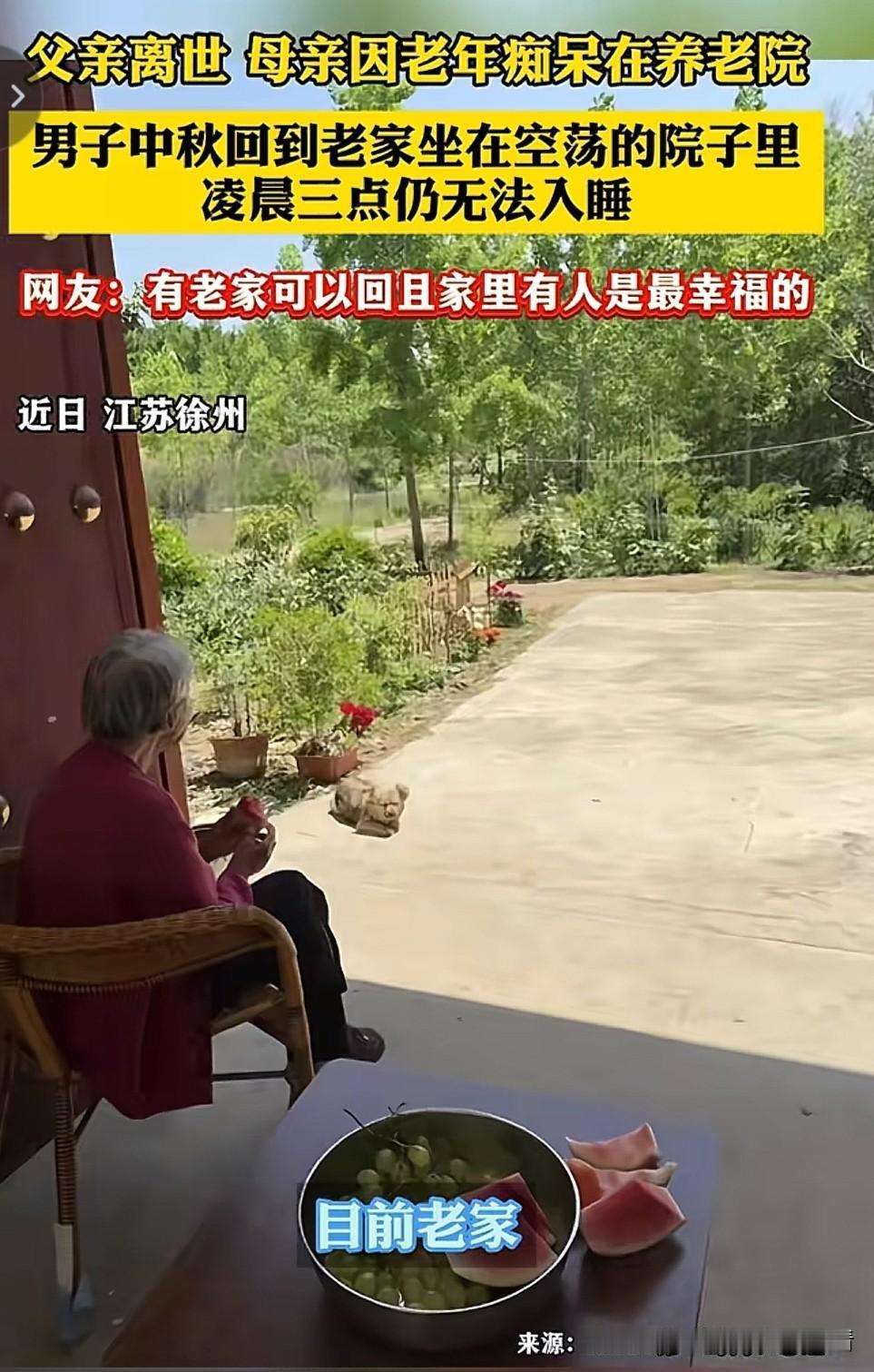 我刷到江苏徐州范先生的视频,眼泪一下没绷住。 视频里他中秋赶回老家,推开门却是满院杂草,曾经被母亲打理得整整齐齐的花园,如今荒得看不见路。父亲三年前走了,母亲患了严重的老年痴呆,早被送去了养老院,认不出人也记不得家。 他说自己凌晨三点还睡不着,爬起来在屋前屋后转了好久。以前回来,父母早把房间收拾干净,被窝都是晒过的暖乎气;现在床铺发霉,屋里飘着潮味,只能自己勉强铺好将就躺一晚。坐在空院子里吹风时才懂,原来热闹的从不是老房子,是等你回家的人。 网友评论里一句“有老家可回且家里有人,才是真幸福”戳中了所有人。父母在时,我们永远是孩子,老家是不管走多远都能落脚的归处;可他们不在了,老屋只剩回忆,连回去都成了“做客” 。范先生说哪怕只是坐一会儿也觉得心安,毕竟这里埋着童年,有过被捧在手心的日子。 这个中秋,突然特别想给爸妈打个电话。那些被我们嫌唠叨的日常,其实是最珍贵的幸福啊。趁还来得及,一定要多回家看看。