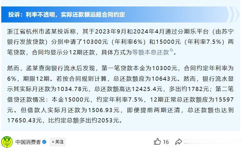 据报道,浙江省杭州市孟某投诉称,其于2023年9月和2024年4月通过分期乐平台(由苏宁银行发放贷款)分别申请了10300元(年利率6%)和15000元(年利率7.5%)两笔贷款,合同均显示分12期还款,具体方式为等额本息还款。