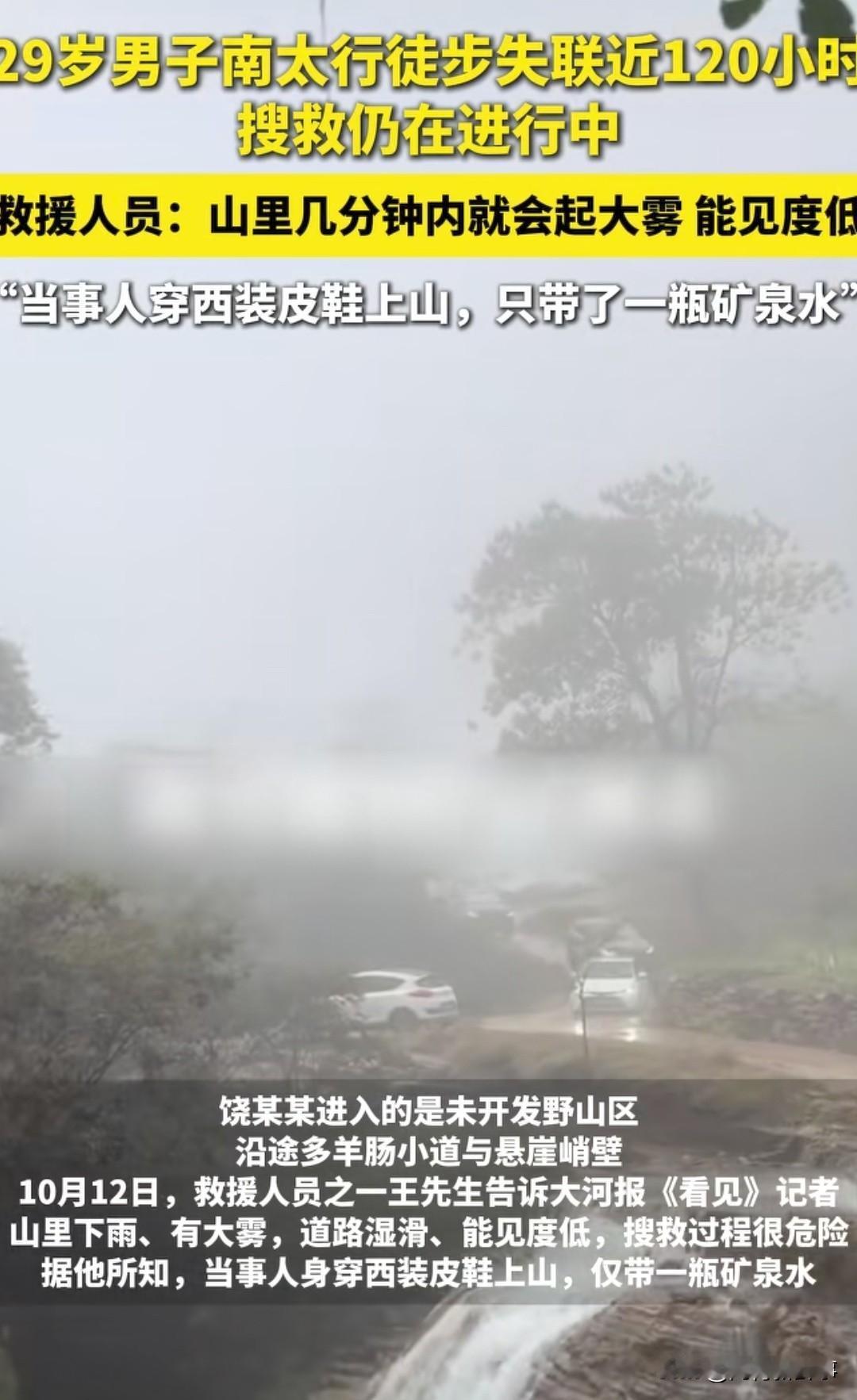 我的天! 穿西装皮鞋进山,只带一瓶水!29岁男子失联120小时,结果…… 今天,河南南太行的迷雾里,救援队员摸着湿滑的山路找了整整5天。29岁的他穿西装皮鞋上山,只带一瓶矿泉水——这事一出,谁看了不揪心? 为啥会走到这一步?内行人才知道的3个隐患:一是他进的是未开发山区,路险雾大;二是装备完全“业余”,西装皮鞋在泥里根本走不动;三是只带一瓶水,在山里撑不过半天。救援队员说:“山里几分钟就起大雾,人走着走着就没影了。” 咱普通人户外徒步,记住这3步能保命:①选成熟路线,别碰“未开发”区域;②备齐登山鞋、冲锋衣、足量水和急救包;③出发前跟家人报备行程,定好报平安时间。 你有没有过户外大意的时候?看到他的西装皮鞋,是不是也替他捏把汗? 关于户外安全,你有啥血泪教训?评论区聊聊!