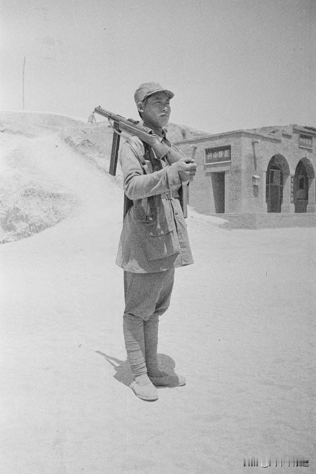 很显然这是一张摆拍的照片,这样的武器和装扮,应该是一位八路军警卫员。而且脚上不是草鞋,而是一双千层底,实属不易!陕北风大沙大,创业不易! - 这是一位八路军警卫员,身着典型的八路军军装,肩扛MP-18型冲锋枪(俗称“花机关”)。 - 背景建筑为陕北窑洞风格,墙上的“河山统一”标语体现了抗日民族统一战线的历史背景。 - 该照片是美国记者在延安时期拍摄,记录了八路军战士的风貌,展现了抗日战争时期中国共产党领导的武装力量的形象,具有重要的历史纪实价值。
