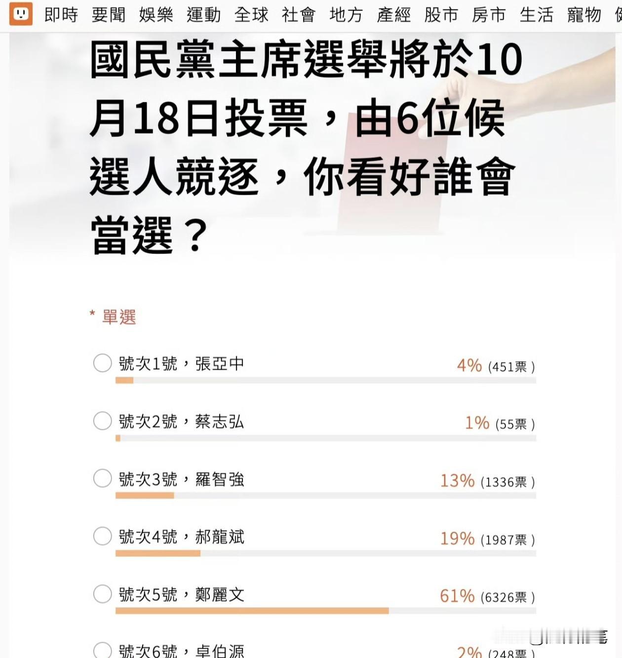 郑丽文网络民调支持率遥遥领先,而郝龙斌获得内部国民党县市长表态支持人数越来越多。