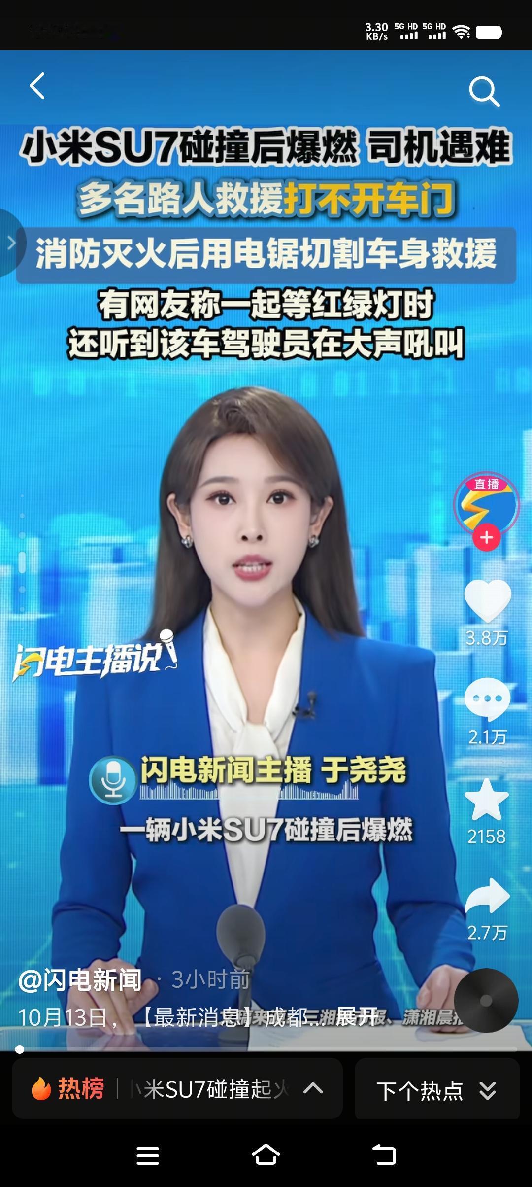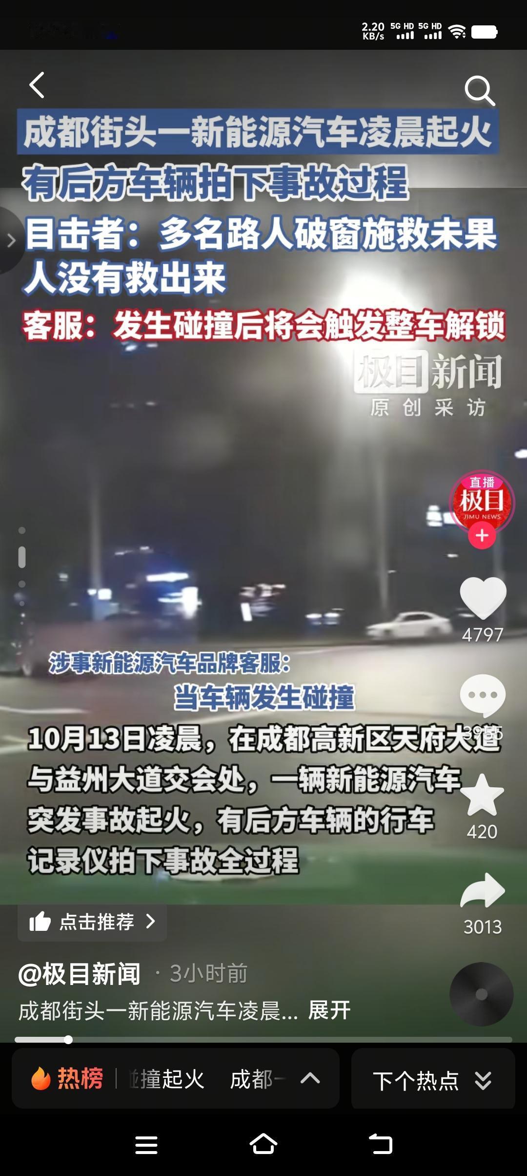 司机在车里大吼大叫,现场人员却束手无策,干着急没办法,车门怎么也打不开,车窗玻璃也砸不烂,直到大火蔓延到无法靠近,只能眼睁睁的看着司机葬身于火海。可想而知,当时的他该有多么绝望,生死之间只隔了一个门,就是打不开。 据说司机是喝了酒,车速非常的快。所以说不管油车还是电车,只要我们遵交通法规,还用担心那些所谓的概率吗?