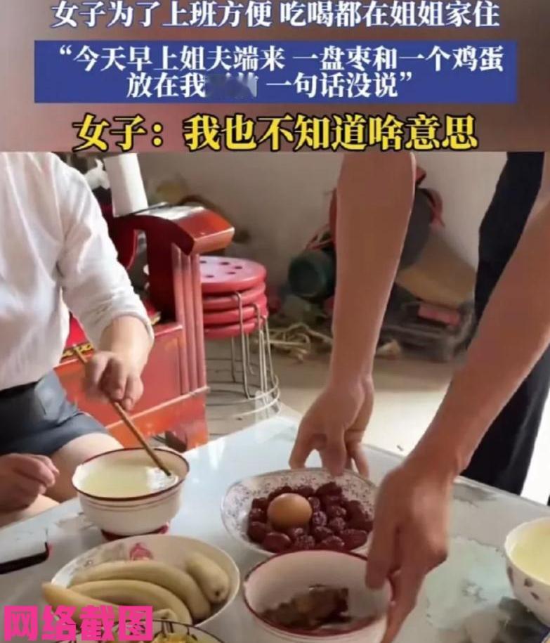 有女子图上班方便直接住姐姐家。 这里所有人都会知道住亲戚家一天两天可以,这长期就有点会落下厌烦,毕竟亲戚家也有正常的生活,有个其他人在场总是感觉不对。 这时女子的姐夫也是如此,但面对小姨子也不好说什么,唯有暗示,这日姐夫端来了一盘红枣里加个鸡蛋,女子还感到奇怪只是没有真正理解,于是发视频称不知啥意思。 有人说,这是姐夫用最为直接的方式告诉了女子眼前的心思,算是比较体面的表述,也是维护了家里人的体面。 女子此刻也应该知道长时间打扰姐姐家不是一件好事,有时还是要懂得一些分寸,毕竟姐姐是成家的人,需要一些私密空间,但身边总有个人打扰也不是个事。 现在女子应该明白了姐夫的用心,回来后该收拾收拾回家或自己重新租个地方,让姐姐家也清净一下,这让自己明白有时还是需要点自知之明。