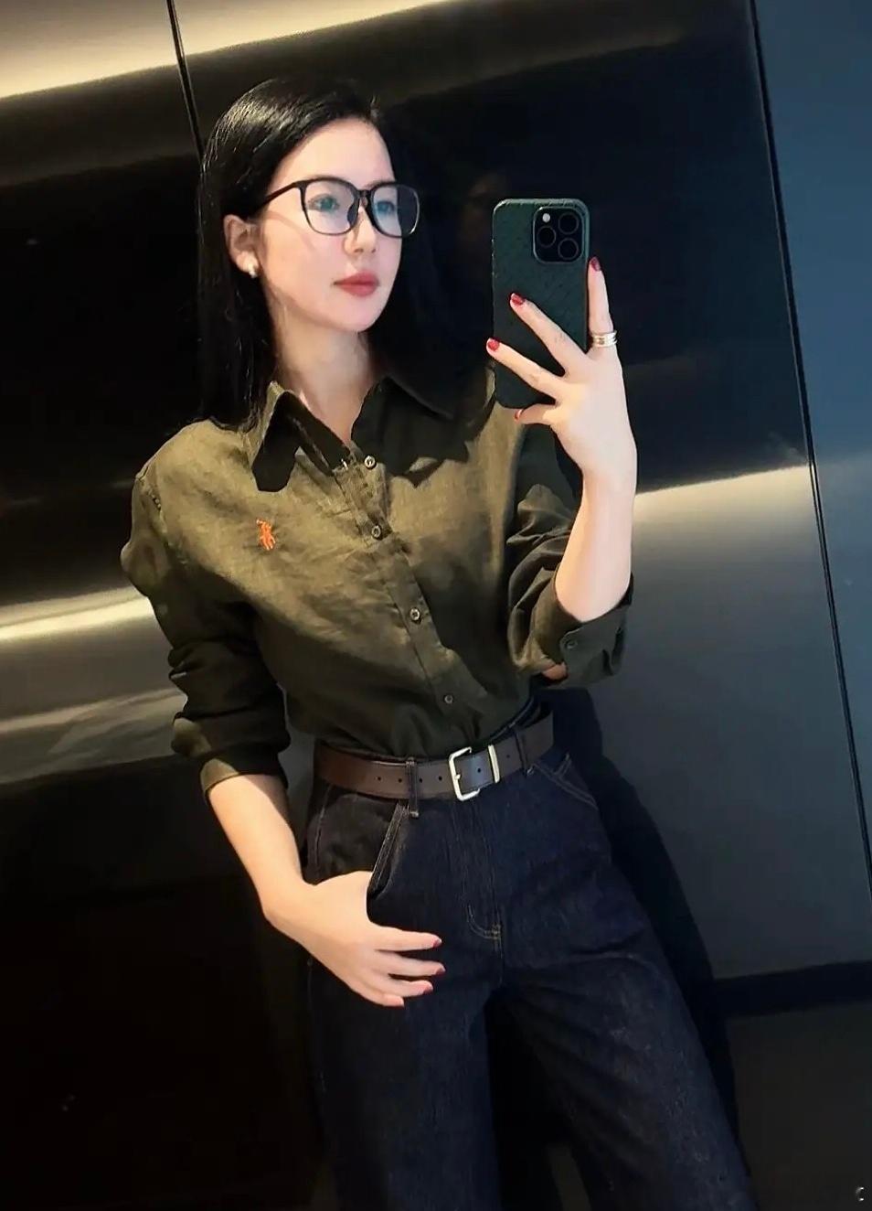 黑色衬衫下搭一条红色的短裙女人味十足。