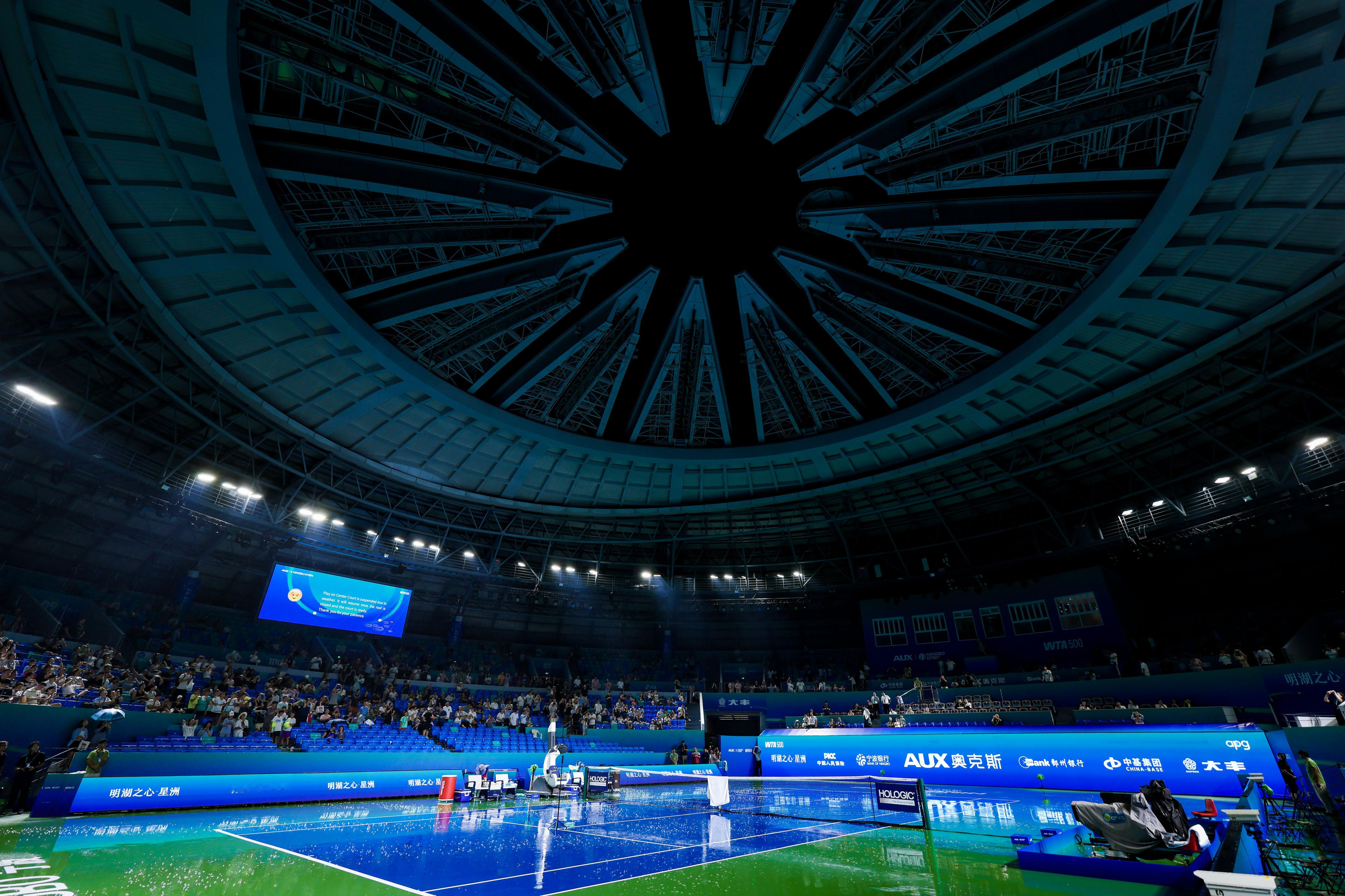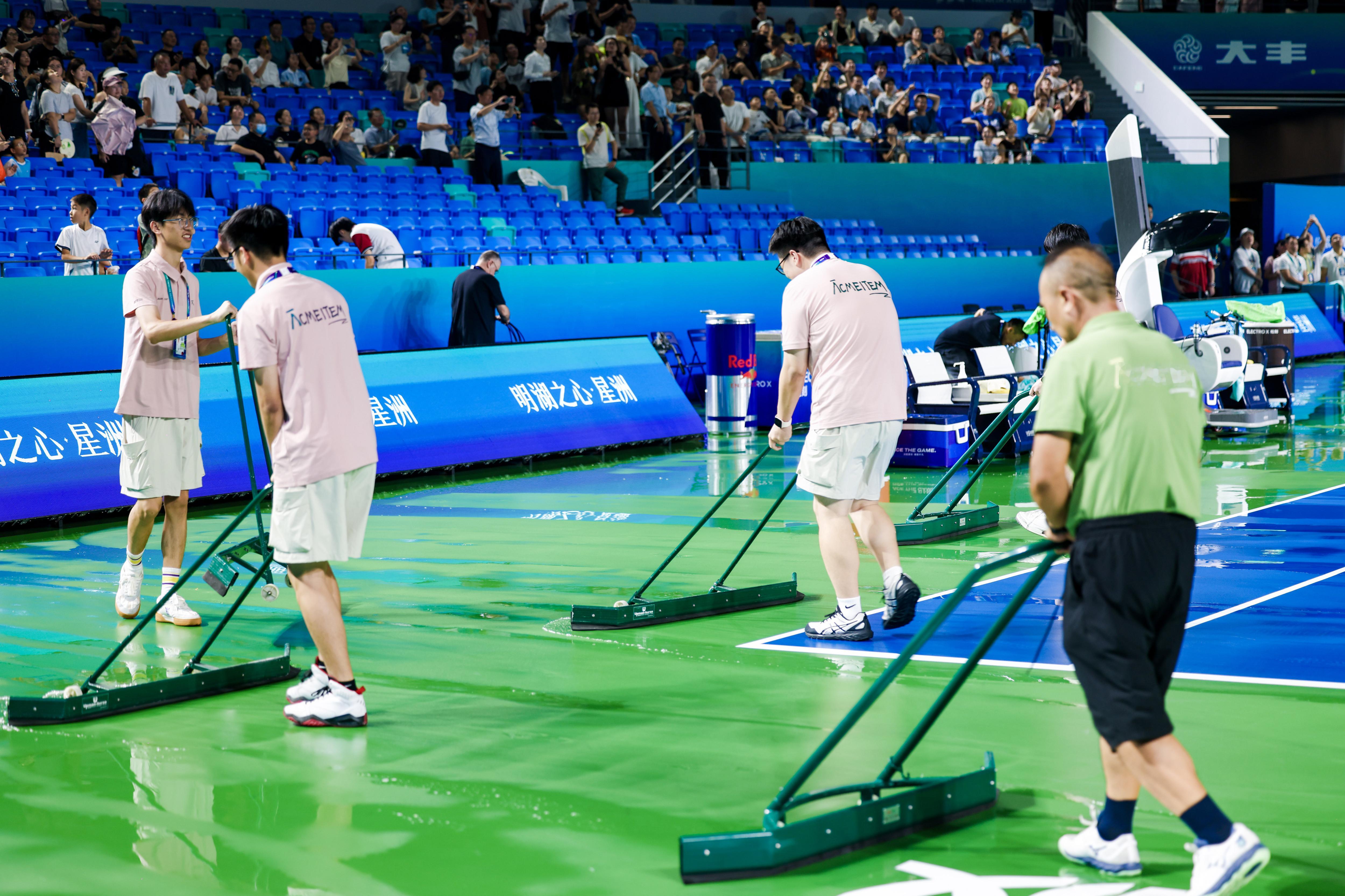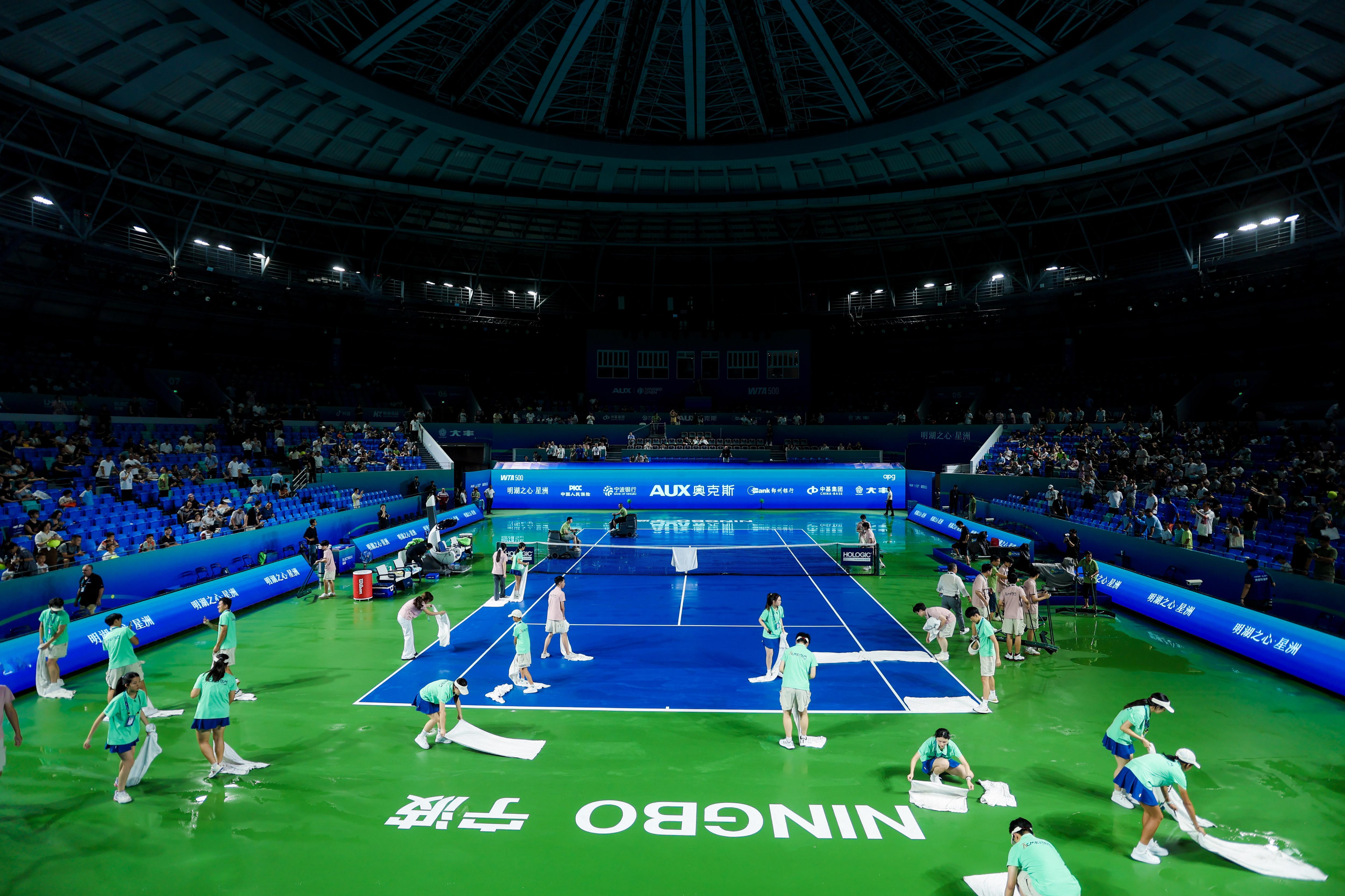 天公先是决定非常配合,让开幕式安然举办完毕;然后突然决定验货一下屋顶,投下瓢泼大雨——真的就是一两分钟内泼下来的,10分钟关闭屋顶已经够快的了,但再快也没有暴雨快啊。宁波这几天看天气预报都有雨,但室外硬地比赛是不能根据预报提前关闭顶盖的;好消息是,明天应该很凉爽了。