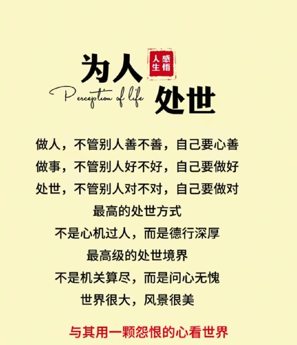 人这一生,有人赞赏你,有人贬低你,有人嘲讽你,有人轻视你,别在意,他们皆为过客;生活本如此,你所行之事无法令众人皆欢。莫为了迎合他人,而迷失自己的方向。 人人都有苦衷,事事都有无奈,不羡慕别人的辉煌,也不嘲笑别人的不幸。人这一辈子,机遇不同,姻缘各异,幸也好,不幸也罢,都是自己的人生,全力做好事情,全力做好自己,人生就算完整。