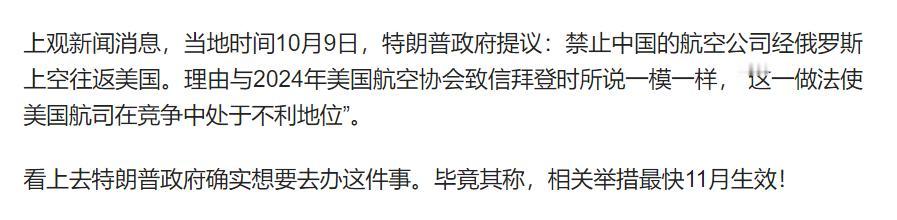 美国发布了对中国的警告! 美国发出警告:中国下个月开始飞往美国航班,不可以经过“俄罗斯上空”,否则禁止降落美国! 当地时间 10 月 9 日美国交通部扔出的提议里说得明明白白,说中国航司飞俄领空让美国航司 “处于不利地位”,还给了 48 小时回应期,放话 11 月就可能正式生效,这通牒下得倒是挺有气势,可惜理亏得很。 这事得从俄乌冲突说起,当初美国带头禁止俄罗斯航司飞美国领空,俄罗斯反手就禁了美欧航司进自己领空,美欧航司只能绕路北极或太平洋,航程变长、油费飙升。 中国没跟着掺和制裁,凭中俄航权协议照样走俄罗斯上空,这下差距就出来了。比如伦敦飞北京,英国航司得比中国航司多飞两个半小时,油钱得多花一大笔。 美国航空协会那些人急了,跑到政府面前哭穷,说这让美国航司每年损失 20 亿美元市场份额,这话听着唬人,其实全是自己作的。 2023 年中美航班谈判时,美国就想玩捆绑,说要增加航班就得先禁飞俄领空,中方没理这茬,谈判直接僵住。现在又拿行政命令施压,说白了就是谈判桌上没占到便宜,想耍霸权硬来。 要知道航空燃油占航司运营成本的 30%,这可是除了买飞机外最大的开销,绕路可不是加几升油那么简单。 就拿北京飞纽约来说,经俄罗斯上空的北方航线大概 11000 公里,绕太平洋得多出 2000 多公里,按波音 787 每百公里耗油 6 吨算,单次航班就得多烧 120 吨油,按现在油价算光油钱就得多花近百万,这还没算飞机折旧、机组超时这些成本。 南航之前有趟航班为了备降,光放油就损失 21 万,还不算上百万的其他费用,可想而知长期绕路得亏多少钱。 更有意思的是,美国航司自己搞不定,就撺掇政府撒野。代表美国航空、联合航空这些巨头的游说团体,天天在国会念叨 “不公平”,可他们咋不提是美国先发动的制裁?现在中美每周有 98 趟直飞航班,要是全改绕路,不光航司成本暴涨,乘客也得跟着遭罪。 中秋国庆期间北京飞新加坡的机票高峰时都涨到 4700 多,要是中美航线再涨一波,普通旅客怕是更吃不消。而且航班时间变长对老人小孩来说太折腾,之前国航有趟航班为了送急症旅客返航,光放油就损失几十万,要是以后航班都得绕远路,遇到紧急情况处置起来更麻烦。 特朗普这会儿跳出来搞事情,心里打的全是选举算盘。2026 年中期选举要到了,他急需在选民面前装 “强硬”,拿中国说事最能讨好保守派。 加上近期中美经贸摩擦多,他想在各个领域施压,把航班这事当成筹码。可这招实在不高明,外交部早把话挑明了,说美方该反思自己政策的后果,而不是让全球消费者买单。 欧洲航司之前也跟着起哄,法航荷航、汉莎都跑去游说政府,想让中国航司也不能走捷径,这吃不到葡萄说葡萄酸的劲儿,跟美国如出一辙。 其实航权这东西是按国际民航组织规则来的,中国航司飞俄领空合法合规,没义务为美国的制裁买单。美国自己把路走窄了,反而怪别人走得顺,这霸权逻辑也是没谁了。 要是真实施禁令,中美航司都得受影响,但美国航司那 20 亿损失的说法根本站不住脚,毕竟他们的成本上涨是自己制裁的后遗症,跟中国没半毛钱关系。 现在全球航空业刚从疫情里缓过来,中美航线好不容易恢复点元气,美国非要横插一杠,最后可能是航司亏本、旅客埋单,也就特朗普能把这赔本买卖包装成 “为美国争利益” 了。