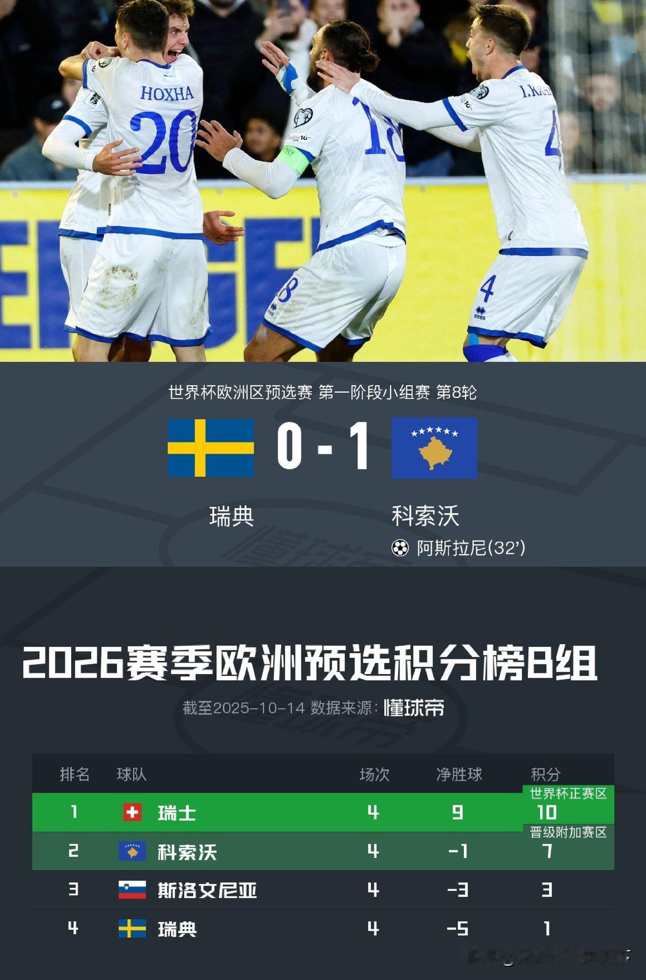 哟,这瑞典比咱国足还丢人啊!拥有伊萨克,哲凯赖什,伊兰加和林德洛夫居然踢不过科索沃,真是笑死个人。 瑞典这么强的阵容都输成这样,看来还是主教练的事。 不过好在瑞典有附加赛名额,现在只是拿不到直接晋级名额,所以这几场输赢对瑞典来说无所谓,反正又不能直接晋级,换个教练好好备战附加赛吧。 这么看,如果瑞典和意大利这些欧洲强队都进不了世界杯的话,那咱们进不去心里也平衡多了啊。 不过人家欧洲弱队能爆冷击败瑞典意大利,为什么我们不能爆冷击败沙特或者澳大利亚呢?