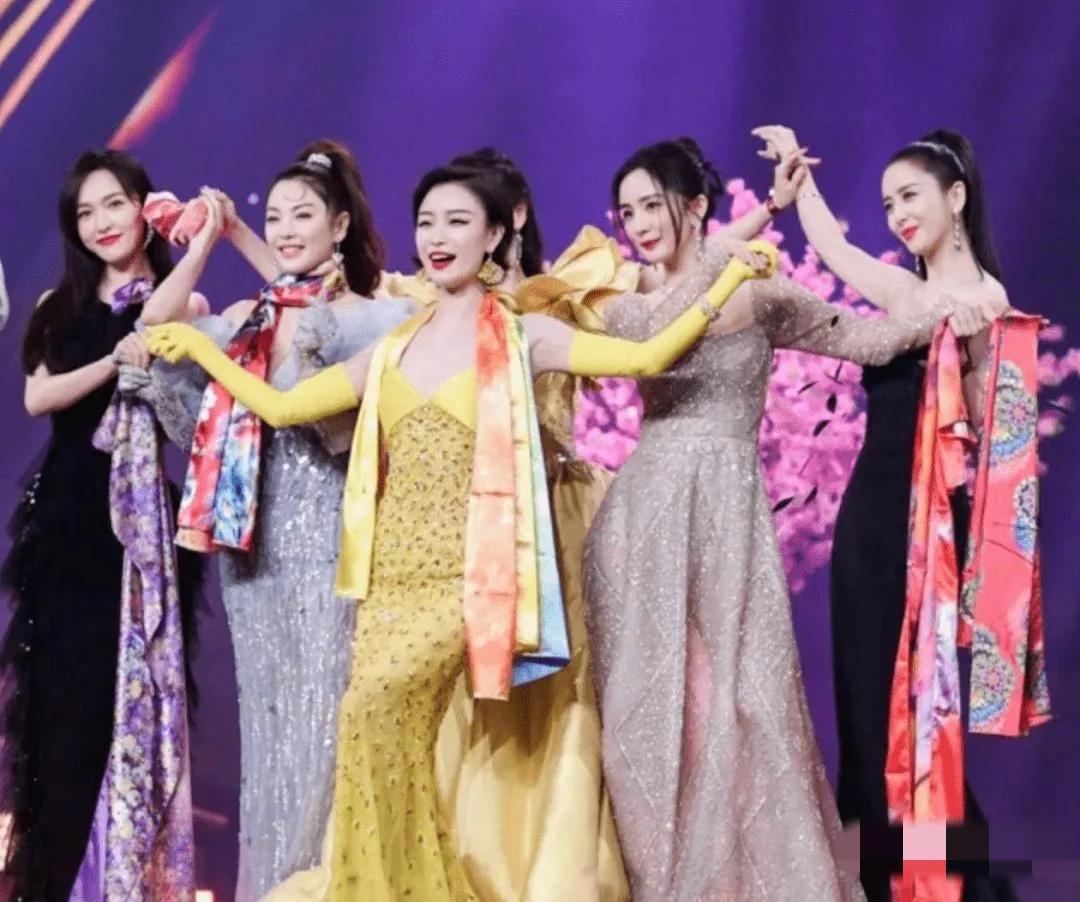 五位85花同框:我一眼就认出了娇柔腰柳的佟丽娅,楚腰卫鬓的杨幂,长发垂肩的唐嫣;一袭黄裙的倪妮,那位扎着高马尾、穿银色长裙的是谁?