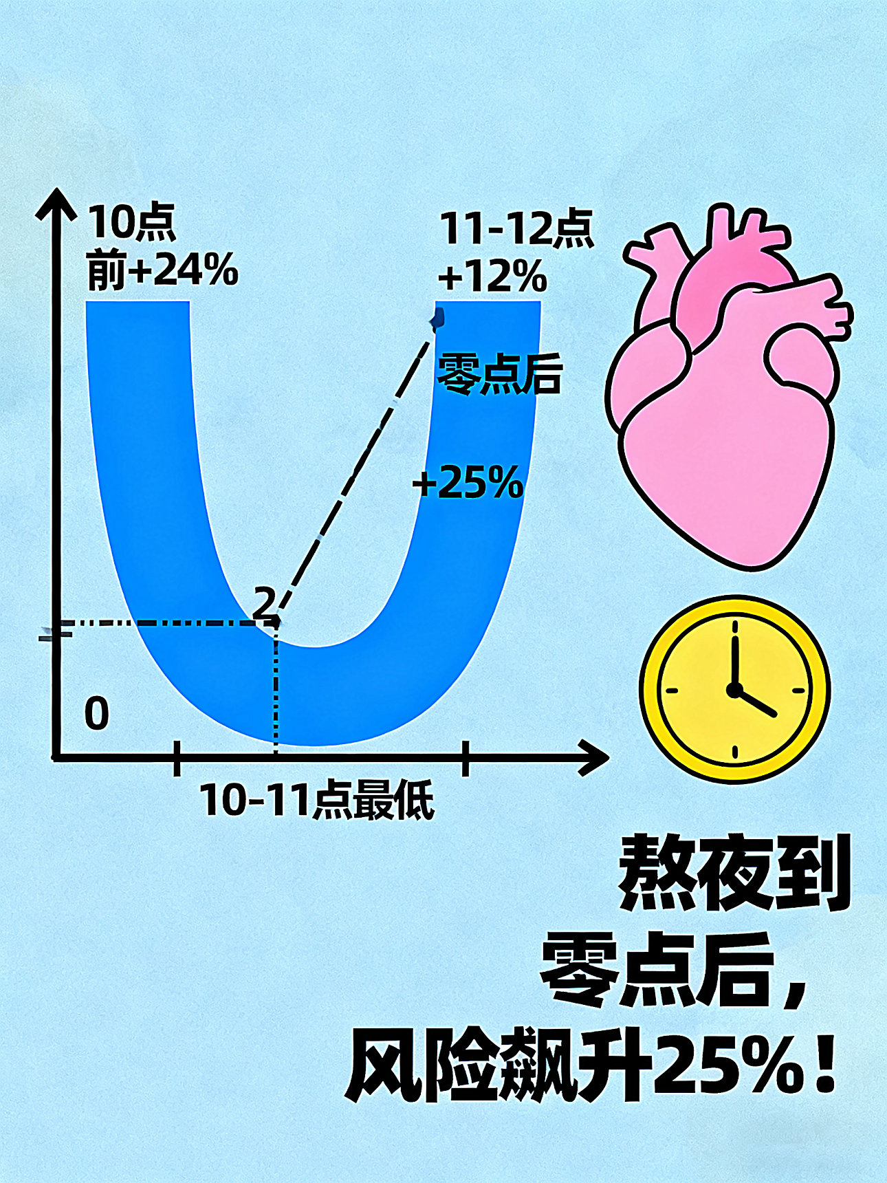 这项研究由英国团队完成,追踪了8.8万名成年人长达5.7年,结果发现入睡时间与心血管疾病风险呈“U型”关系。简单说,就像找平衡点:晚上10点到11点入睡,风险最低;早于10点睡,风险反而增加24%;11点到12点睡,风险增12%;而熬夜到零点后,风险直接飙升25%!为什么?