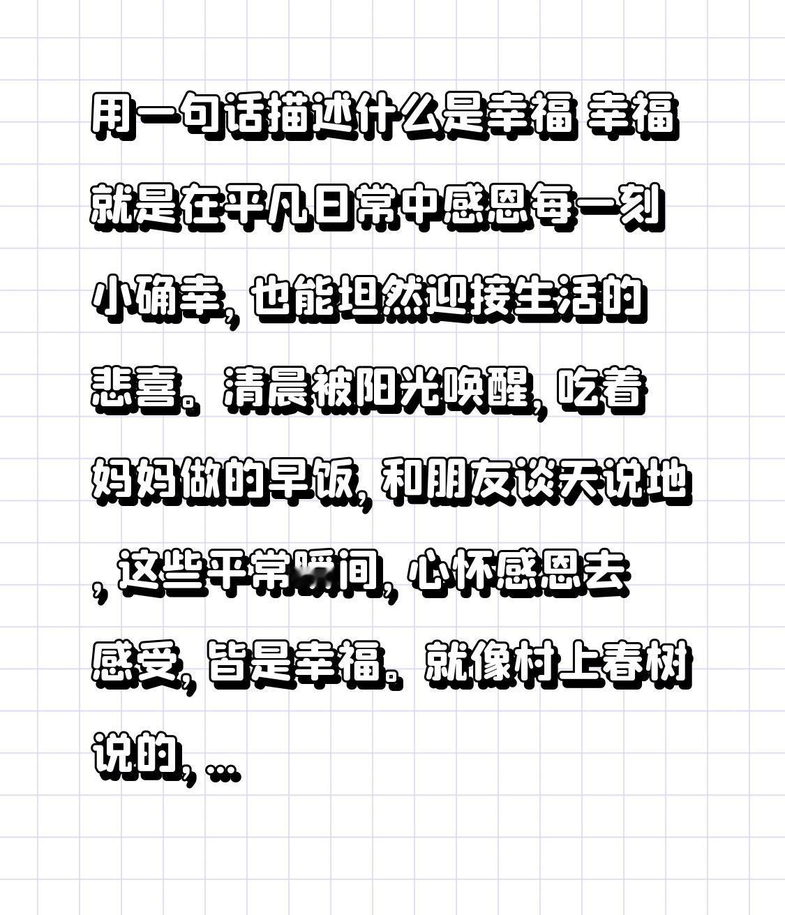 用一句话描述什么是幸福 幸福就是在平凡日常中感恩每一刻小确幸,也能坦然迎接生活的悲喜。 清晨被阳光唤醒,吃着妈妈做的早饭,和朋友谈天说地,这些平常瞬间,心怀感恩去感受,皆是幸福。就像村上春树说的,认真对待小事能收获确定的幸福。而且研究显示,常感恩的人心理幸福感高出25%。同时,人生有起伏,像苏轼被贬仍乐观,“一蓑烟雨任平生”,坦然面对挫折也是幸福的一部分。如此,便是幸福的模样。