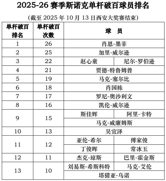 2025-26赛季斯诺克单杆破百球员排名 (截至2025年10月13日西安大奖赛结束) 排行榜的五大显著特点—— 第一,此次排行榜较上一次排名赛后排行榜有天壤之别:上榜球员出现根本性的排名变化;上榜球员的单杆破百数增加明显。 第二,西安大奖赛一役,肖恩-墨菲打出9次单杆破百,排名第二;加里-威尔逊打出11次单杆破百,排名第一。在此次年度排行榜上大幅跃升,分别占据第一、二位。 第三,“八〇五虎”“八〇六虎”都在,并且排名不错;“七五三杰”只在两人还在(约翰-希金斯2025-26赛季迄今仅打出3次单杆破百),并且排名不佳。 第四,我球员七人(赵心童,肖国栋,斯佳辉,吴宜泽,傅家俊,丁俊晖,常冰玉)上榜,显示团队总体能力越来越强大。 第五,我上榜球员七人(赵心童,肖国栋,斯佳辉,吴宜泽,傅家俊,丁俊晖,常冰玉),年龄最大的47岁(傅家俊),年龄最小的21岁(吴宜泽),老将、中坚、新秀梯队分布,持续建设和良性发展势头明显。 加“关注”,一起关注精彩斯诺克 -