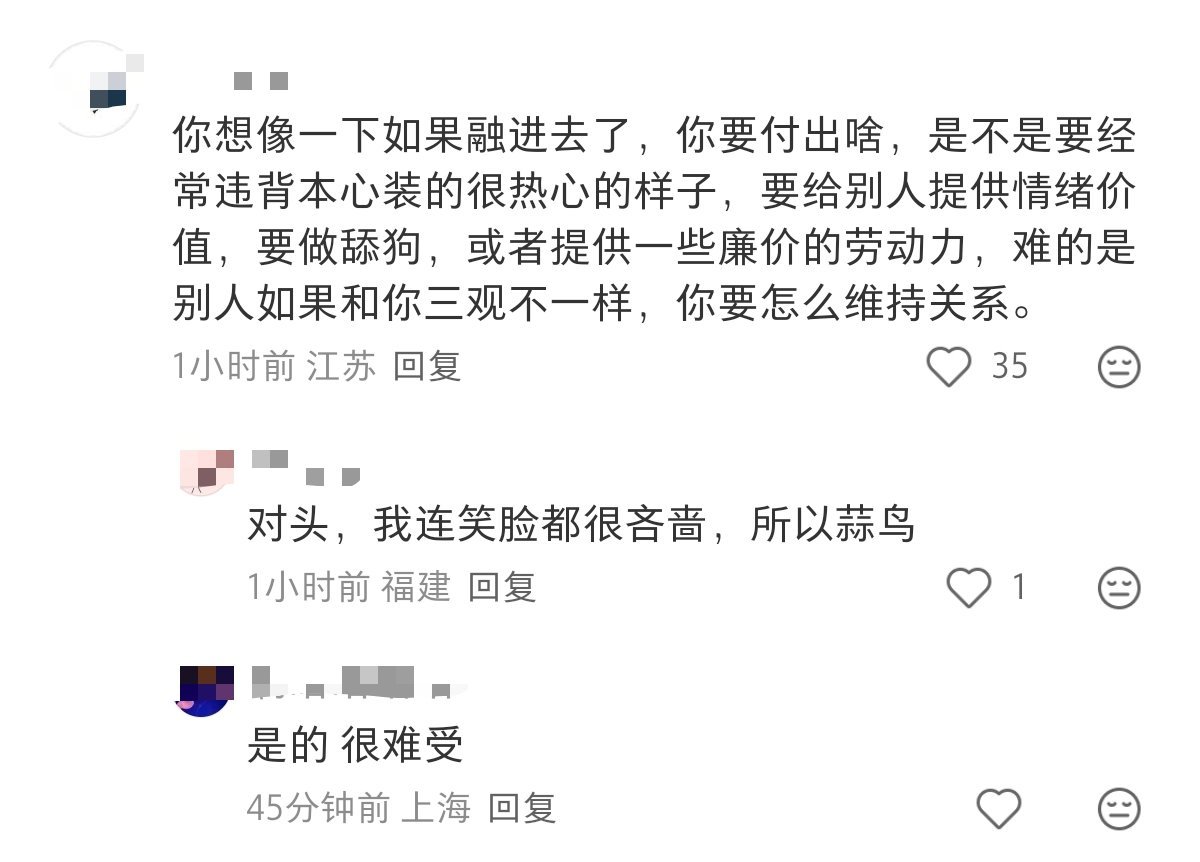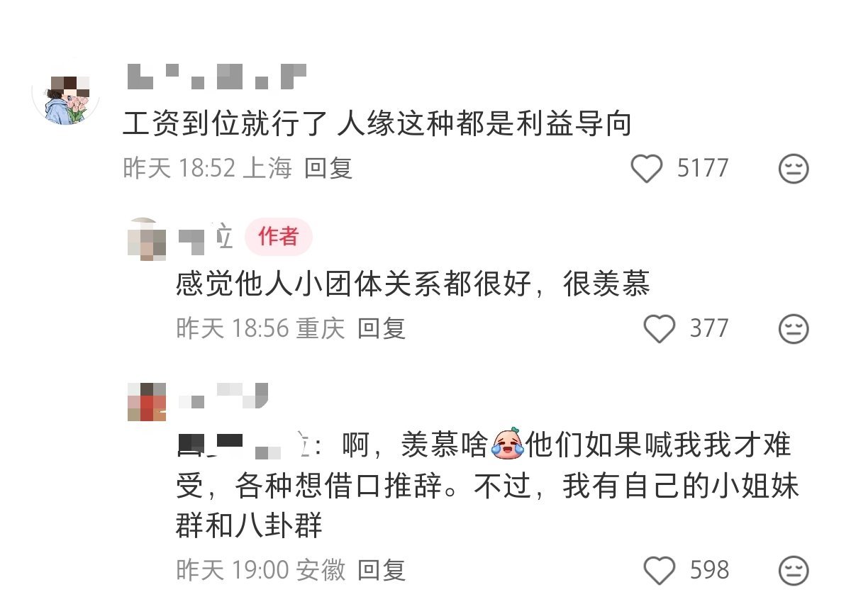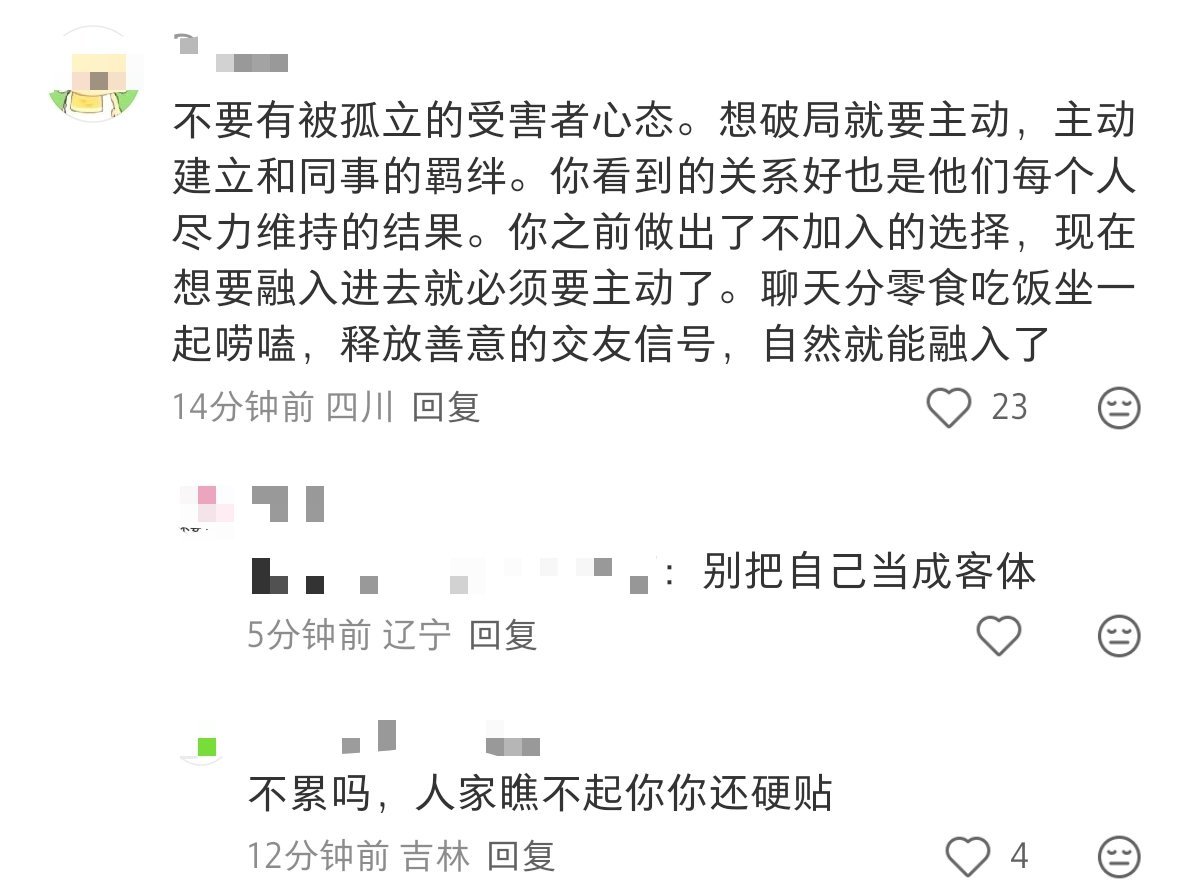 又要上班又要做舔狗,好累呀。评论区说的对,不是人缘差,而主要是她没有价值,她要是有价值,就算性子冷若冰箱,也会一堆同事们舔上去,不敢这样子公开边缘化她。