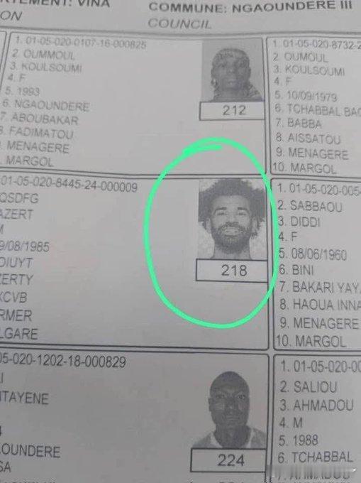 一条穆罕默德·萨拉赫的照片出现在喀麦隆恩冈代雷三区的选民登记册上!