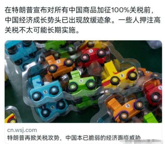华尔街日报刊文声称,特朗普在掀关税攻势,中国本已经“脆弱”的经济面临威胁!10月14日,美媒刊文表示,在特朗普宣布对所有中国商品加征100%关税前,中国经济成长势头已出现放缓迹象。中国的经济正面对多方面的挑战,而特朗普的攻势,让中国需要面对的问题进一步加剧。 这种说法乍一听好像有点道理,但仔细琢磨就会发现不对劲。美媒字里行间都在刻意塑造一种认知,那就是美国现在处于绝对强势地位,中国已经顶不住压力了。 他们还拿中国制造商举例,说对成千上万的中国厂商来说,这是似曾相识的一幕。四月份美国对中国施加145%关税的时候,不少中国玩具厂商的生意确实面临过崩溃风险。 但他们只提这些困难,却绝口不提中国厂商后来的应对。那些玩具厂商没有坐以待毙,有的转向国内市场开发新的消费场景,有的把生产线搬到东南亚规避关税,还有的干脆升级产品做高端定制,没过多久就慢慢缓了过来。 美媒故意放大中国经济遇到的问题,却对中国应对挑战的能力视而不见。他们忘了中国有全世界最完整的工业体系,从上游原材料到下游组装配送,每个环节都能找到替代方案。 就拿关税这事来说,中国不是第一次面对。前几年美国加征关税的时候,中国就已经摸索出一套应对办法,比如扩大和其他国家的贸易合作,和东盟、欧洲的自贸协定不断升级,把对美贸易的依赖慢慢降了下来。 2024年中国和东盟的贸易额已经突破6万亿美元,比和美国的贸易额多出将近2万亿,就算对美出口受点影响,其他市场也能补上。 而且中国国内市场的潜力还在不断释放,去年社会消费品零售总额超过47万亿元,比前一年增长了5.8%。很多厂商把目光转回国内后,发现本土消费者的需求比想象中还要旺盛。 那些之前靠出口美国生存的玩具厂,现在开发的国潮玩具在国内卖得热火朝天,有的还通过直播电商卖到了全球其他国家,根本不用再看美国关税的脸色。 美媒还刻意忽略中国经济的韧性。疫情期间中国是全球主要经济体里唯一实现正增长的国家,后来面对全球经济下行压力,中国又通过减税降费、加大基建投资、扶持中小企业等政策,稳住了经济基本盘。 2024年中国新增减税降费超过1.2万亿元,给制造业企业提供的专项贷款达到3.8万亿元,这些政策实实在在帮企业扛过了难关。 再说特朗普的关税政策,其实美国自己也没占到便宜。之前加征关税的时候,美国国内的物价跟着上涨,普通消费者买东西要花更多钱,美国零售商也怨声载道。 2023年美国从中国进口的家具价格上涨了23%,电子产品价格上涨了18%,这些成本最后都转嫁到了美国老百姓身上。 现在特朗普又要加征100%关税,美国商会已经明确反对,说这会让美国企业失去中国这个大市场,还会让美国的供应链变得更脆弱。 中国经济确实面临挑战,但这些挑战都是发展过程中必然会遇到的,而且中国一直在积极寻找解决办法。美媒故意把中国经济说得不堪一击,无非是想制造恐慌,让中国在贸易谈判中让步。 但他们忘了中国不是软柿子,这么多年来面对各种外部压力,中国从来没有退缩过。相反,每次压力都变成了推动经济转型升级的动力。 就像那些玩具厂商,经历过关税冲击后,反而变得更强大,产品更有竞争力。中国经济也是一样,在应对挑战的过程中,不断优化结构、提升质量,抗风险能力只会越来越强。 美媒想靠一篇文章就抹黑中国经济,让中国屈服,根本就是打错了算盘。中国有足够的底气和能力应对各种风险挑战,特朗普的关税攻势吓不到中国,反而可能让美国自己陷入更大的麻烦。 毕竟现在全球经济相互依存,美国对中国加征关税,最终只会搬起石头砸自己的脚。中国经济的韧性和潜力,不是美媒几句硬话就能否定的,未来中国经济还会继续保持稳定增长,用实际行动打破这些不实言论。