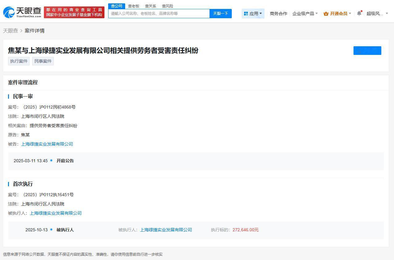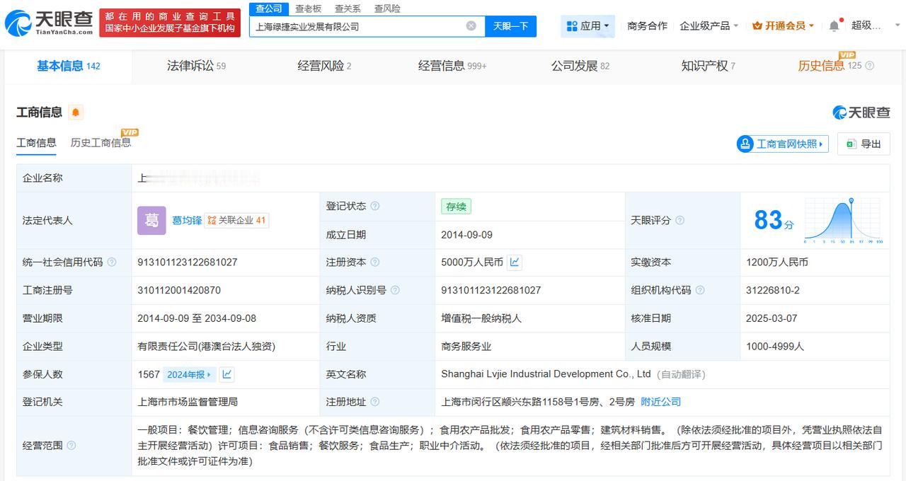 天眼查天眼风险信息显示,近日,上海绿捷实业发展有限公司新增1条被执行人信息,执行标的27万余元,涉及提供劳务者受害责任纠纷案件,执行法院为上海市闵行区人民法院。 该公司成立于2014年9月,法定代表人为葛均锋,注册资本5000万人民币,经营范围包括食品销售、餐饮服务、食品生产等,由GreenExpress Foods, Limited全资持股。据媒体报道,此前,上海通报多校午餐发臭事件。针对市民反映的上海绿捷实业发展有限公司9月15日供应上海市部分学校午餐中虾仁炒蛋存在问题,现已查明绿捷公司涉嫌瞒报食品安全相关信息,目前公安机关已立案侦查,并控制相关人员。 天眼查信息: