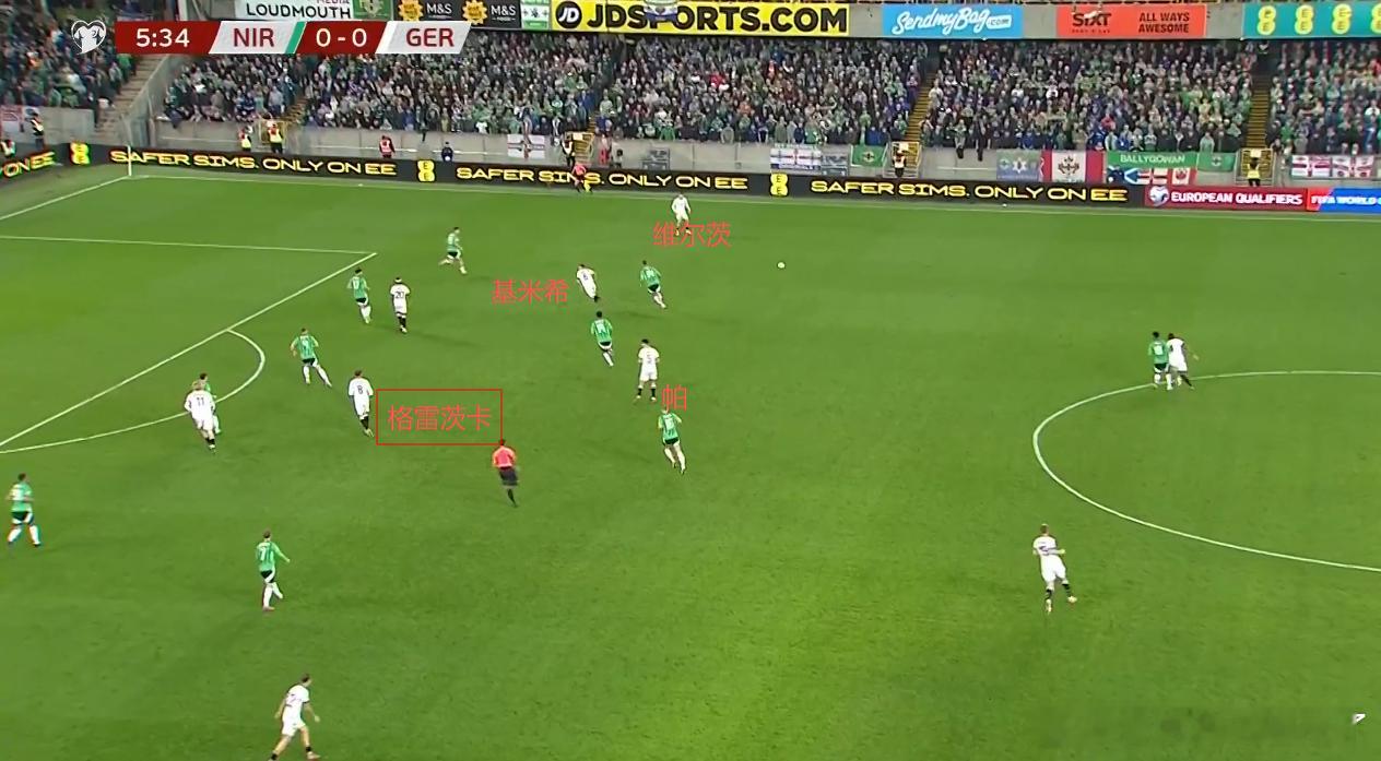 中场角色的灵活分工:当帕夫洛维奇作为单后腰被重点盯防时,回撤协助组织的是中前卫沃尔特玛德,而另一名中前卫格雷茨卡则更多地前插,冲击禁区。这种分工确保了中场的平衡,也为前场的维尔茨提供了支援,特别是右侧,或者中路洗球出来之后,就能找到空挡的维尔茨组织