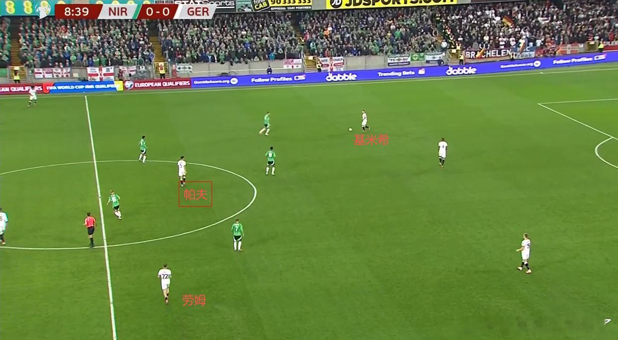 构建左路“强侧”与破逼抢网络:维尔茨固定在高位左翼时,并非孤军作战。左后卫劳姆会大幅内收,而非抱边,与他形成紧密配合;同时,基米希也会从右后卫位置向中路靠拢。这样,球队在由守转攻时,左路区域就形成了一个由维尔茨、劳姆、内收的基米希以及回撤的前锋组成的多人传接网,既能有效破开对手的高位逼抢,也最大限度地规避了维尔茨的身体对抗劣势。