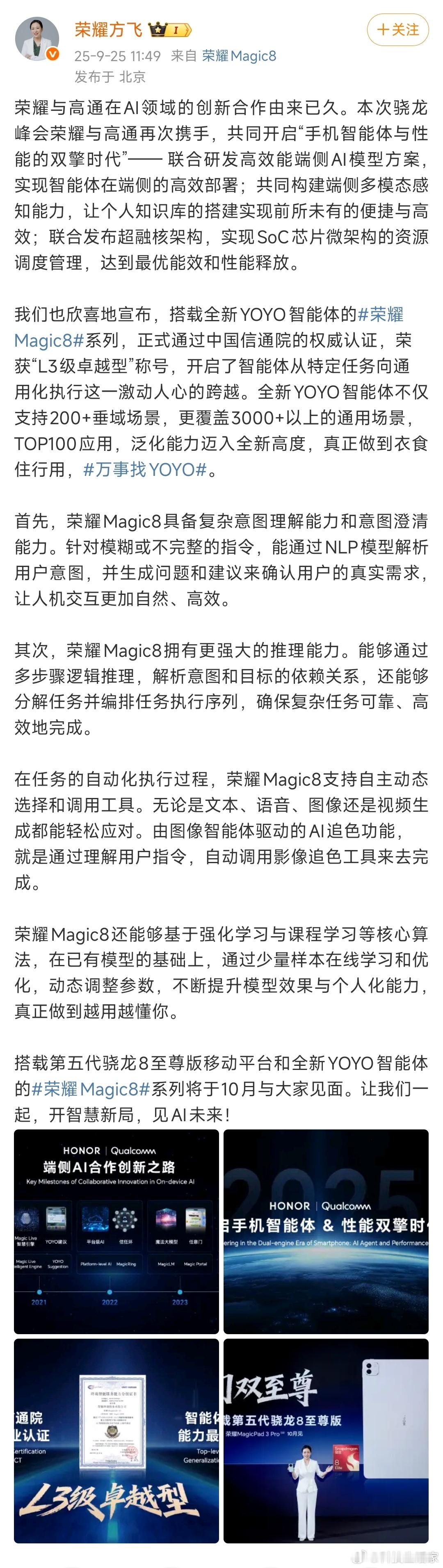 陈震单挑荣耀Magic8当代年轻人要的AI,是“理解”而不仅是“听话”。荣耀Magic8的AI智能体YOYO,做到了!当下的用户需求早已升级,从简单的执行指令跃迁到深层的理解意图。荣耀Magic8系列搭载的YOYO助手,凭借其强大的认知能力,能够洞察用户需求背后的真实目的,并提供贴合的解决方案。这种“心有灵犀”的体验,才是智能交互的核心魅力。我们对于AI的所有幻想,正在一步步照进现实。你期待AI在未来提供怎样的情感化陪伴?或许荣耀Magic8能带来答案。