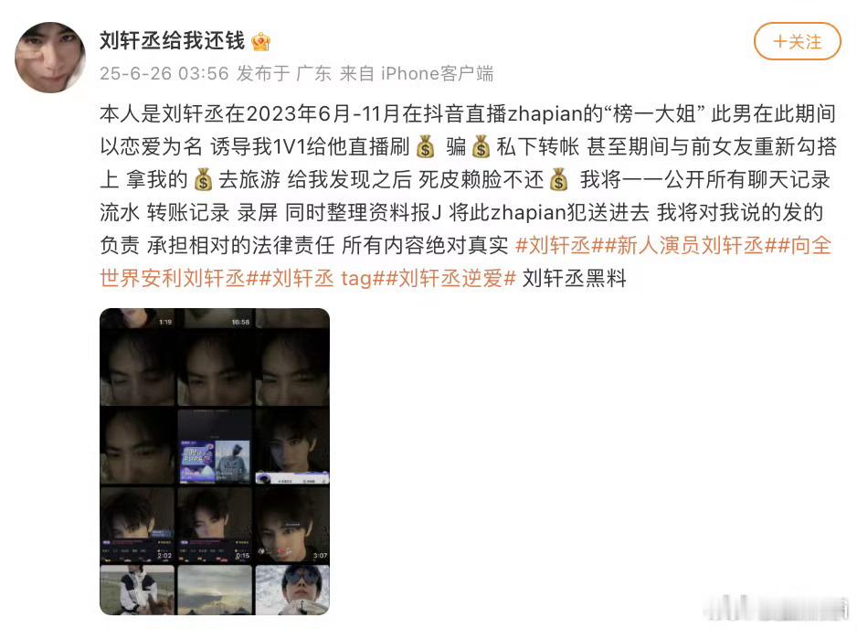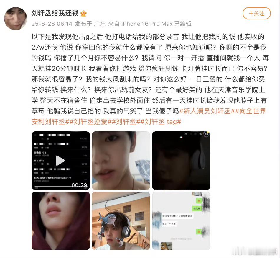 刘轩丞跟女生去酒店6月26日榜一富婆爆刘轩丞录音说被骗钱而且刘轩丞出轨,刘轩丞发声明很硬气的。
