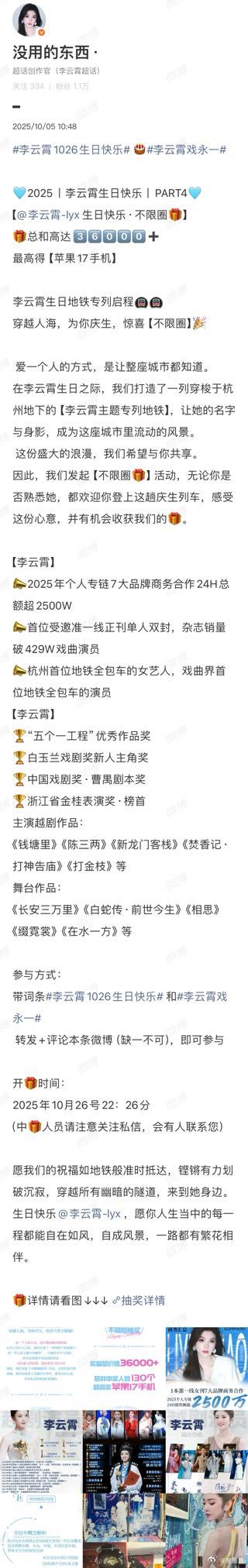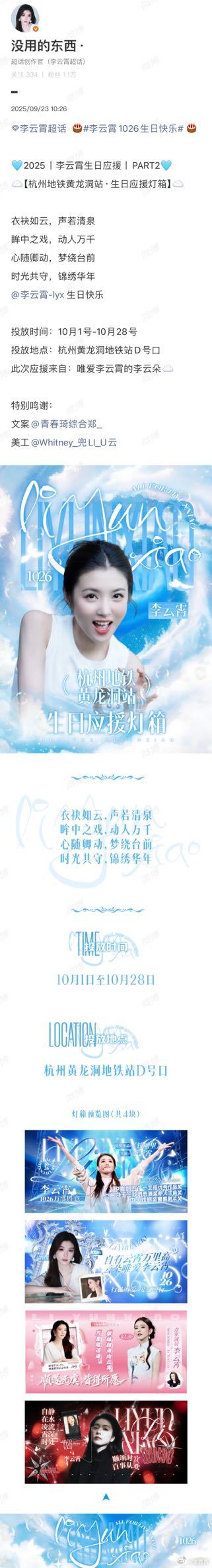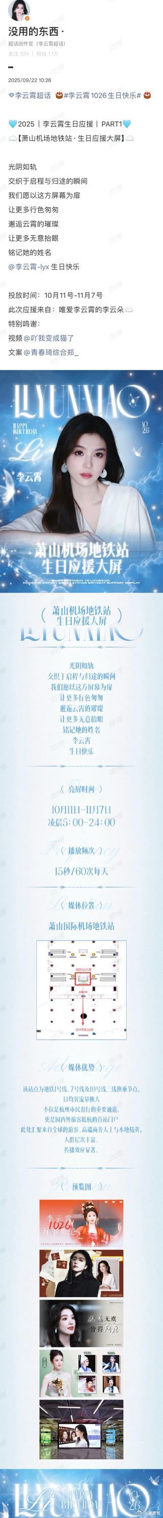 距离李云霄生日还有十多天,李云霄粉丝就做了这么多应援,不仅有李云霄痛铁和全国1111家商场超4000的生日大屏,还有无人机应援活动、线下生咖活动、萧山机场地铁站•生日应援大屏、杭州地铁黄龙洞站•生日应援灯箱、方特十七城联动生日应援大屏、摩天轮 ×4、塔楼x7、双子塔、飞天梯,北京、上海、杭州、武汉、深圳多处大屏、还有不限圈抽奖…预祝李云霄1026生日快乐[爱慕]李云霄